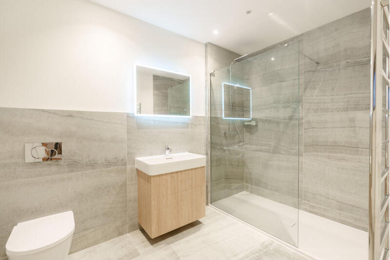 At the heart of Blenheim Hall is a dramatic central living space defined by soaring ceilings, exposed stonework, industrial detailing and rich timber finishes. Floor to ceiling glazing opens onto south facing terraces, flooding the interior with natural light.