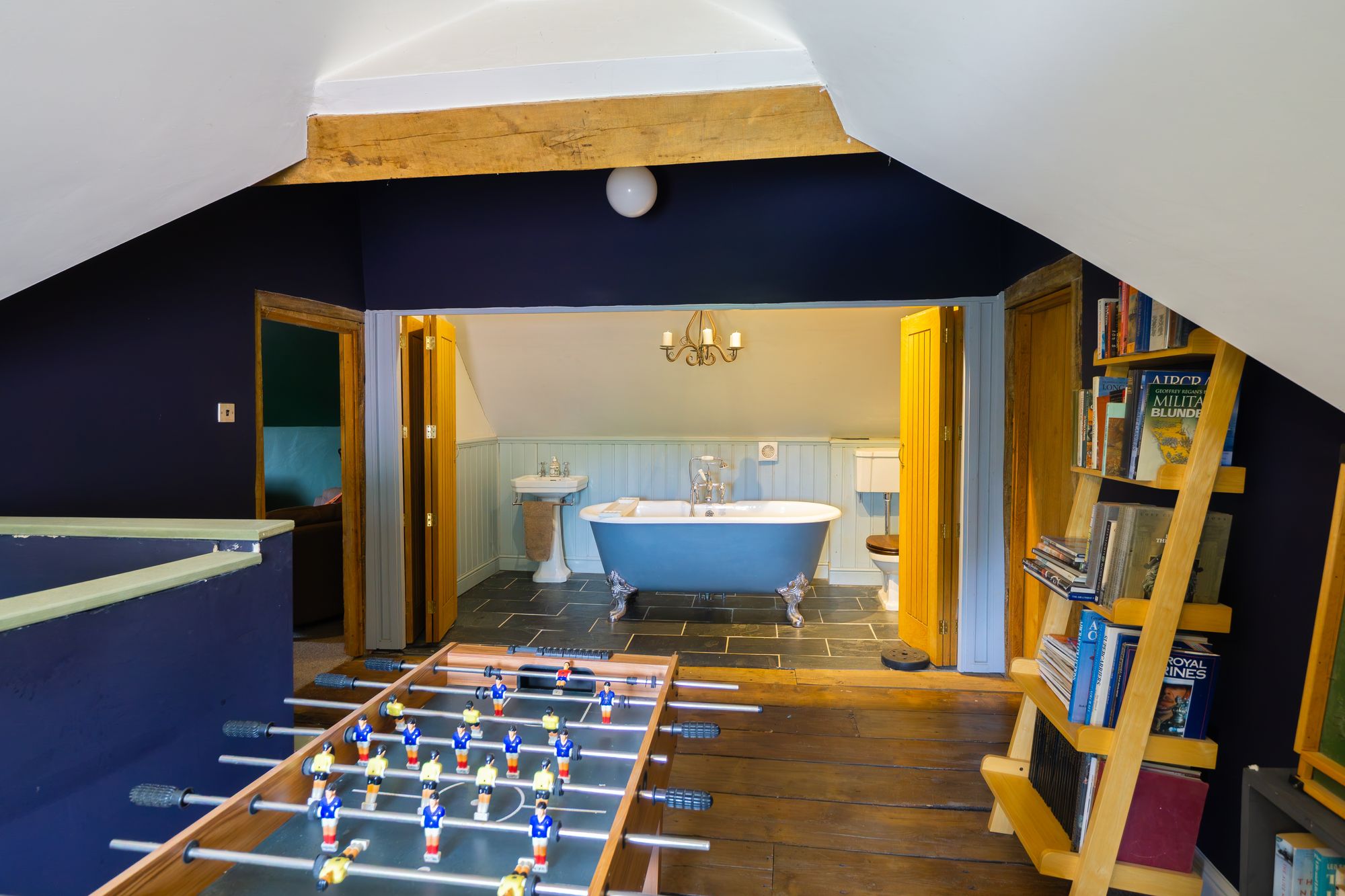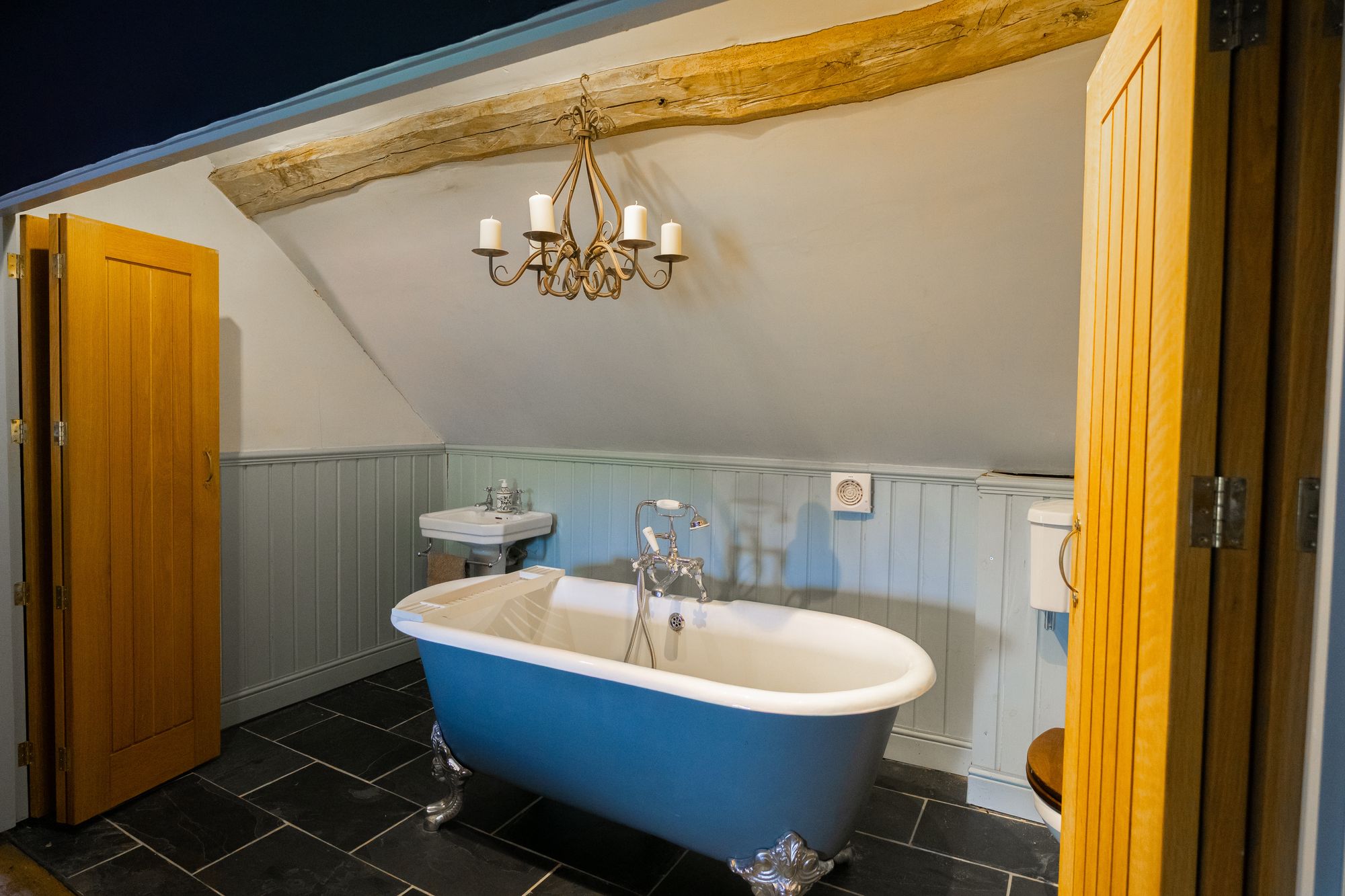 A further staircase rises to the second floor, opening onto a spacious landing where concertina partition doors conceal a stylish bathroom complete with a cast iron roll-top bath. To either side of the landing are two further spacious bedrooms.