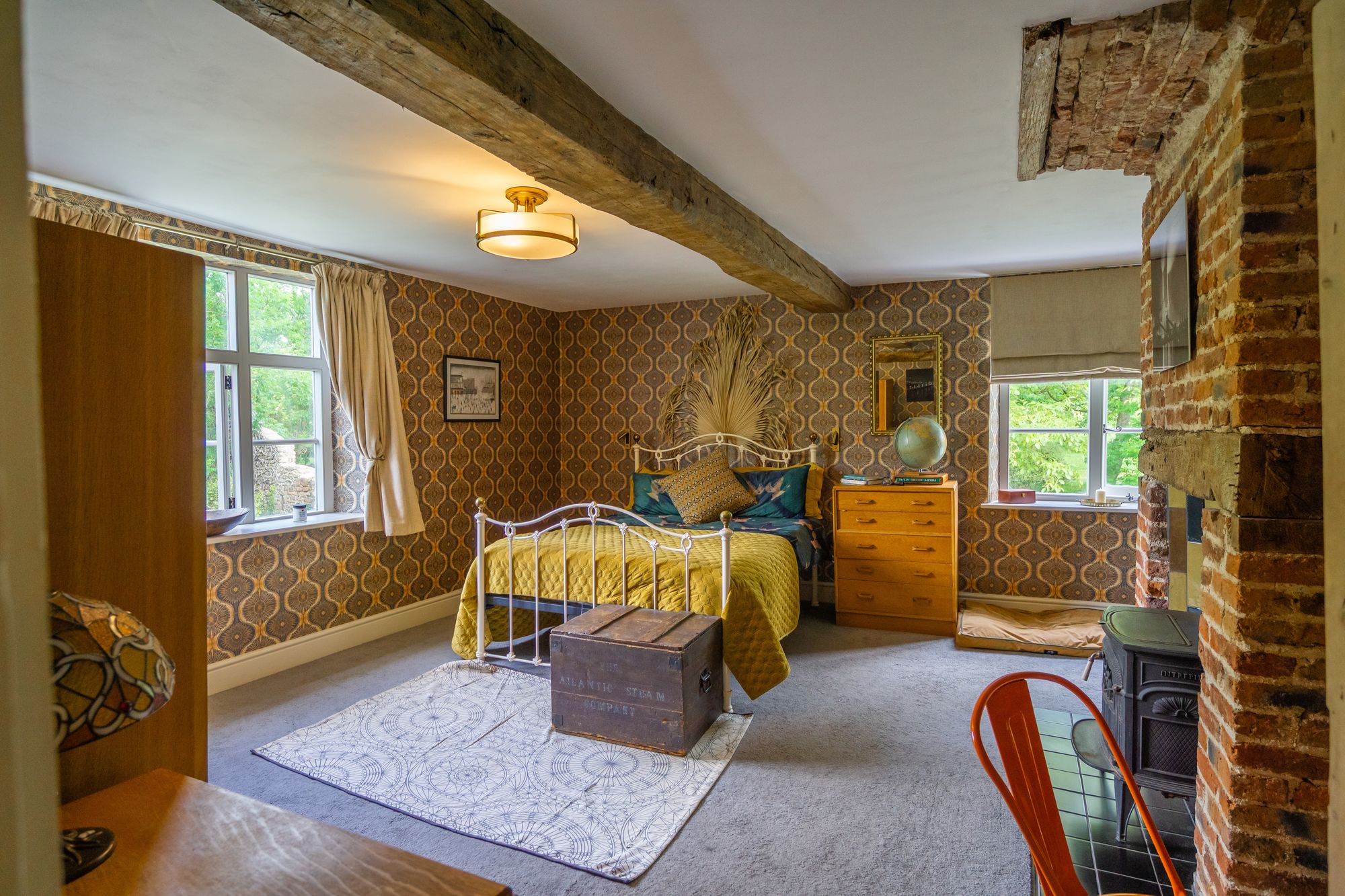 To the rear of the house is the farmhouse kitchen, complete with an original inglenook fireplace housing a Rangemaster cooker (included in the sale), and the original bread oven with potential to be reinstated as a pizza oven. Designed with a rustic feel, the kitchen reflects the owners' desire to preserve its heritage. The quarry tile flooring remains in situ, while sympathetic modern additions include a central island and cabinetry painted in Fired Earth's Oak Apple', with an inset Belfast sink and integrated dishwasher. There is ample space for a dining table, and a stable door opens out to the garden.