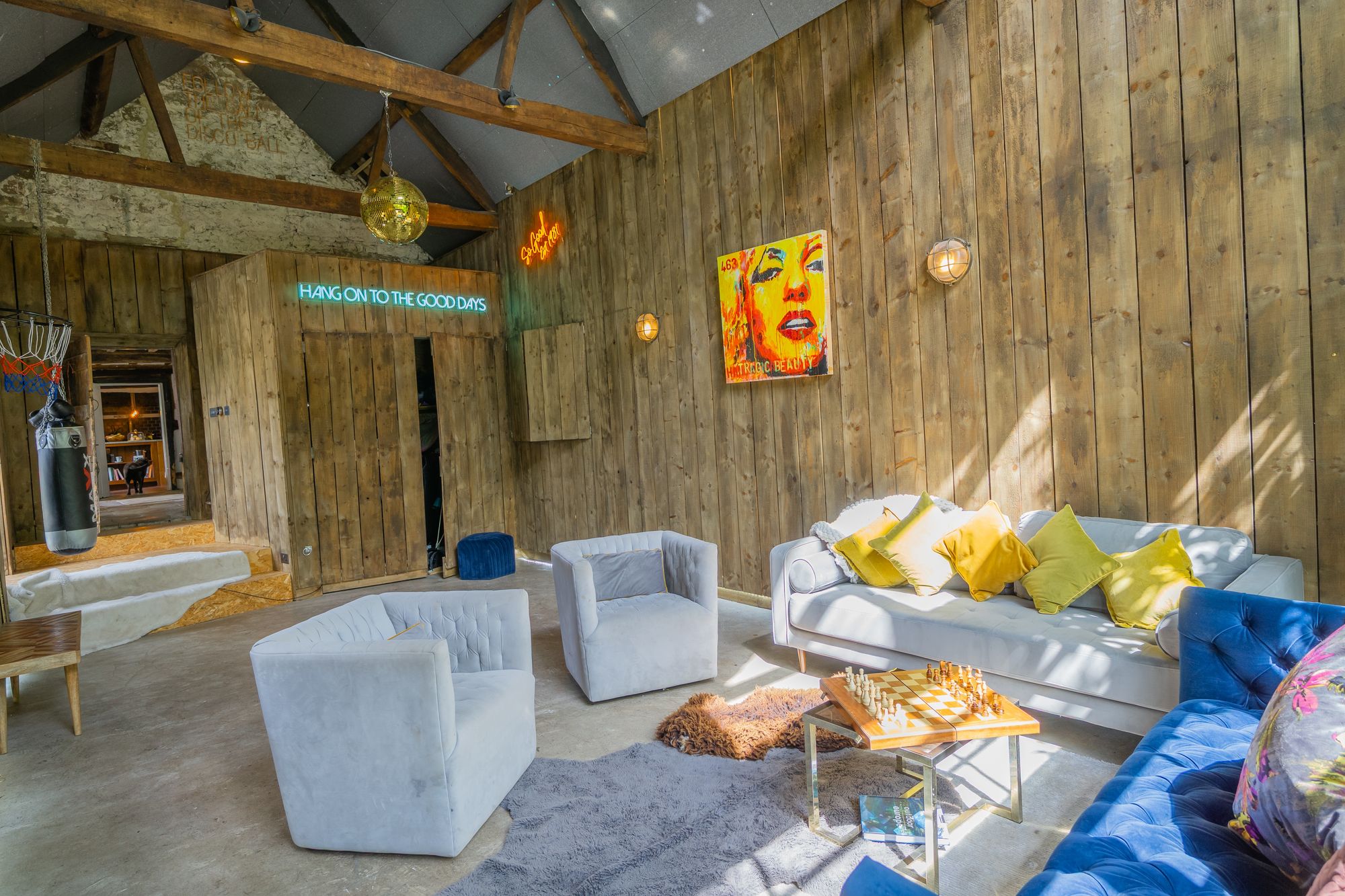 Adjacent to the bathroom is a further door leading to a large space currently configured to support the glamping business, divided into three individual shower rooms and a lounge area. Guests access this space via an external staircase, while an internal connecting door allows access from within the farmhouse if required.