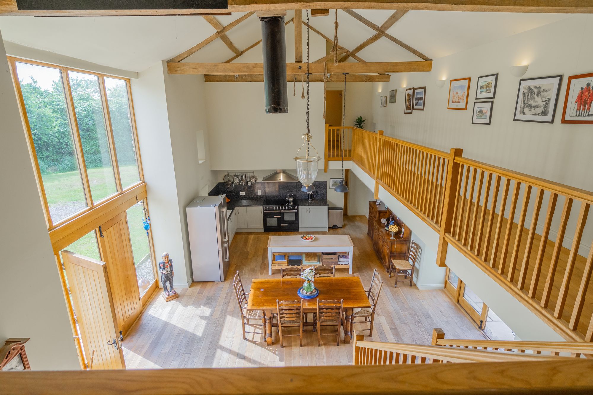 Upstairs, a generous open landing currently serves as a guest bedroom area, in addition to a further double bedroom with a fully glazed wall and a separate bathroom.