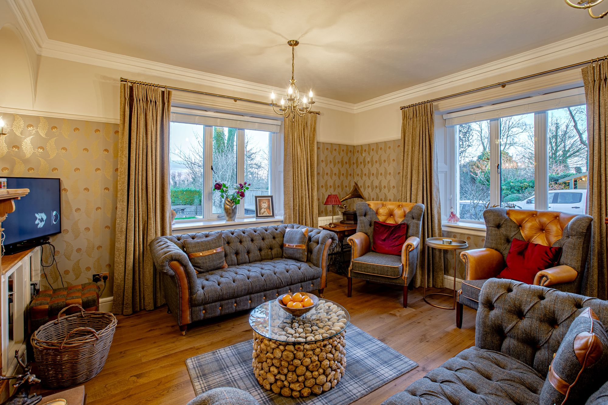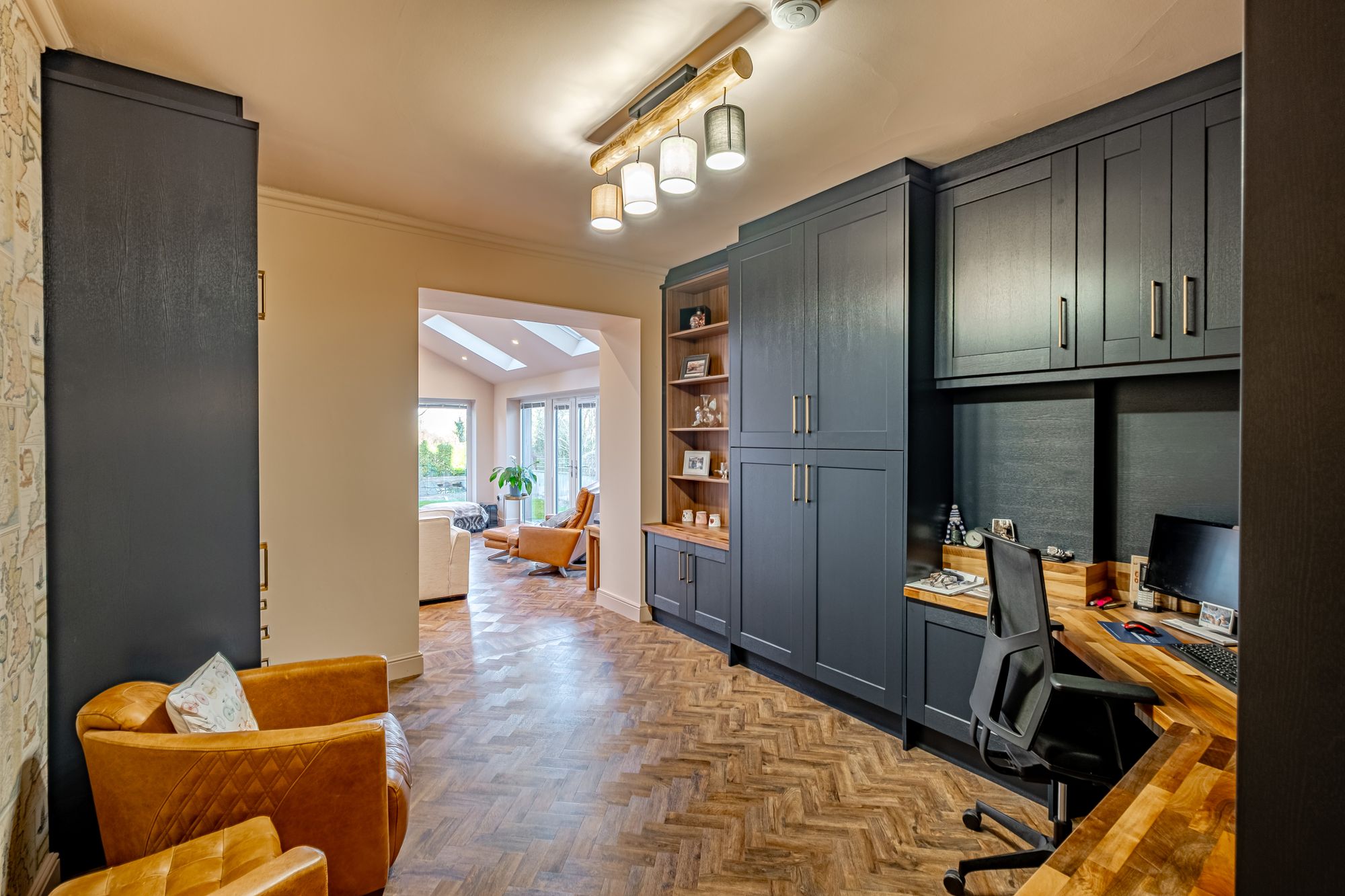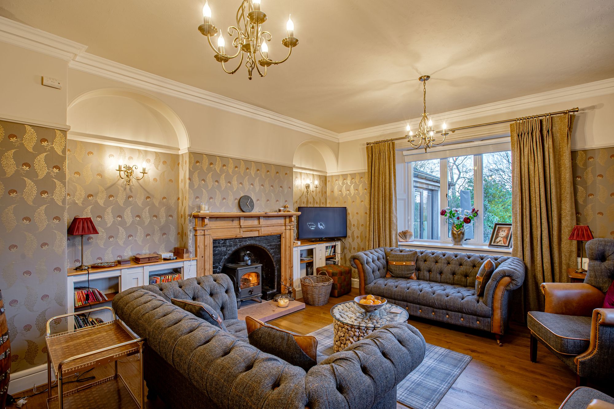 From the main hall, a concealed “secret†door leads to a snug — an intimate secondary reception where a further log burner provides a natural focal point. Large windows frame views across the parking area and gardens, creating a comfortable retreat within the larger home.