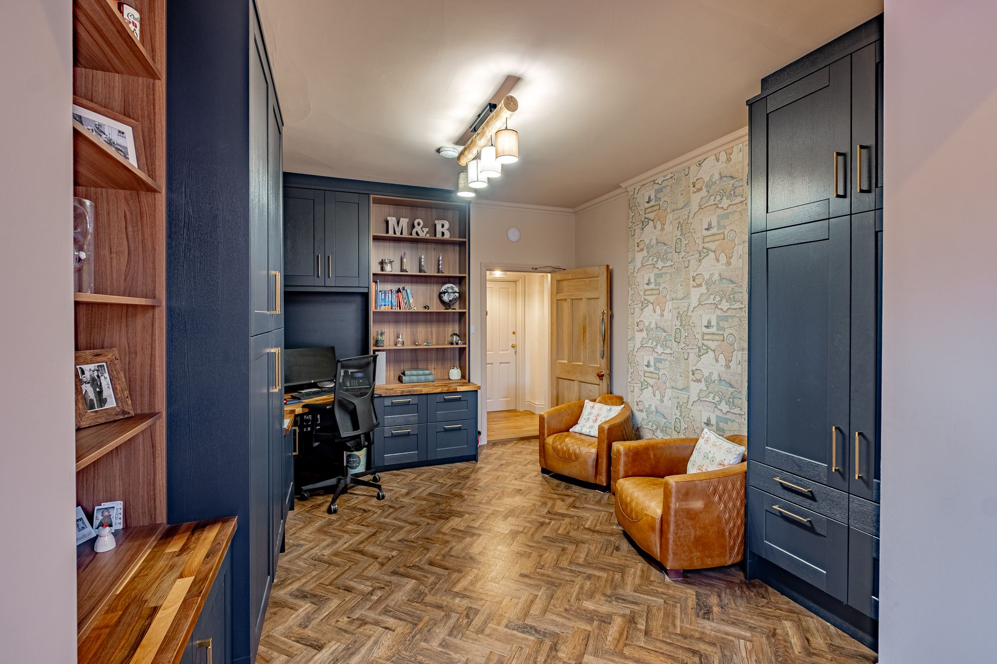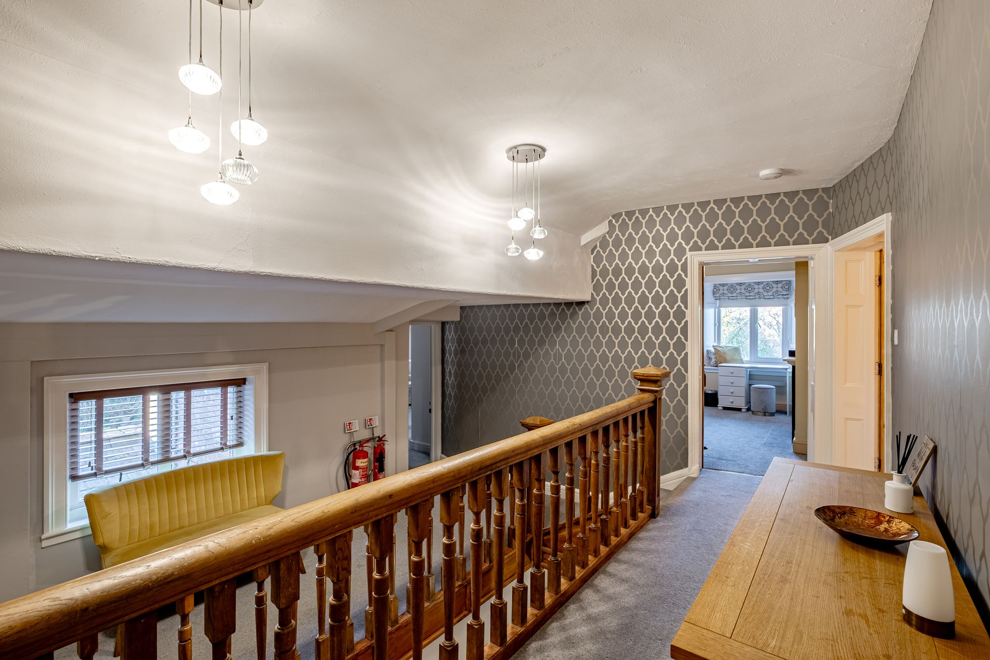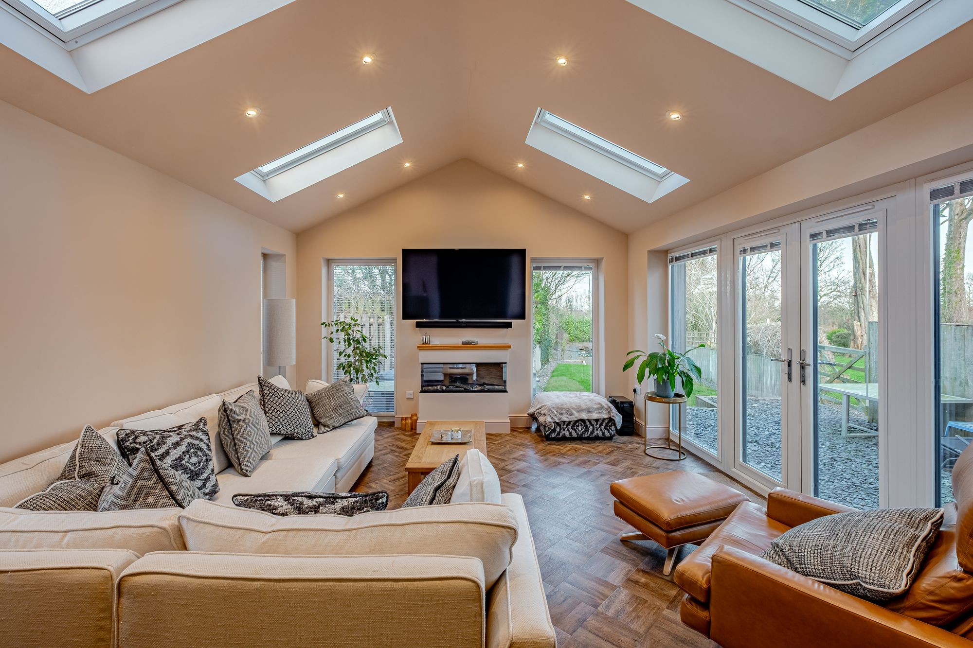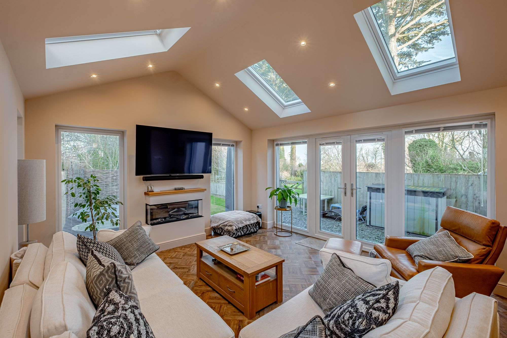 From the main hall, a concealed “secret†door leads to a snug — an intimate secondary reception where a further log burner provides a natural focal point. Large windows frame views across the parking area and gardens, creating a comfortable retreat within the larger home.