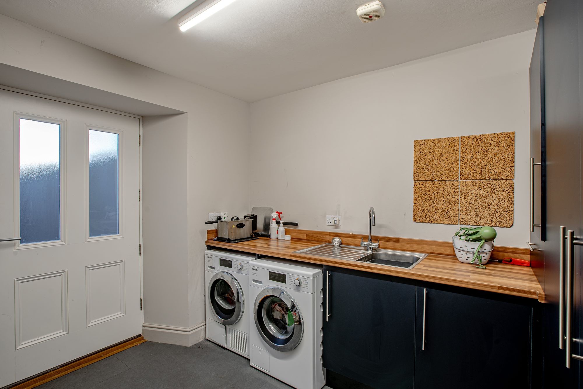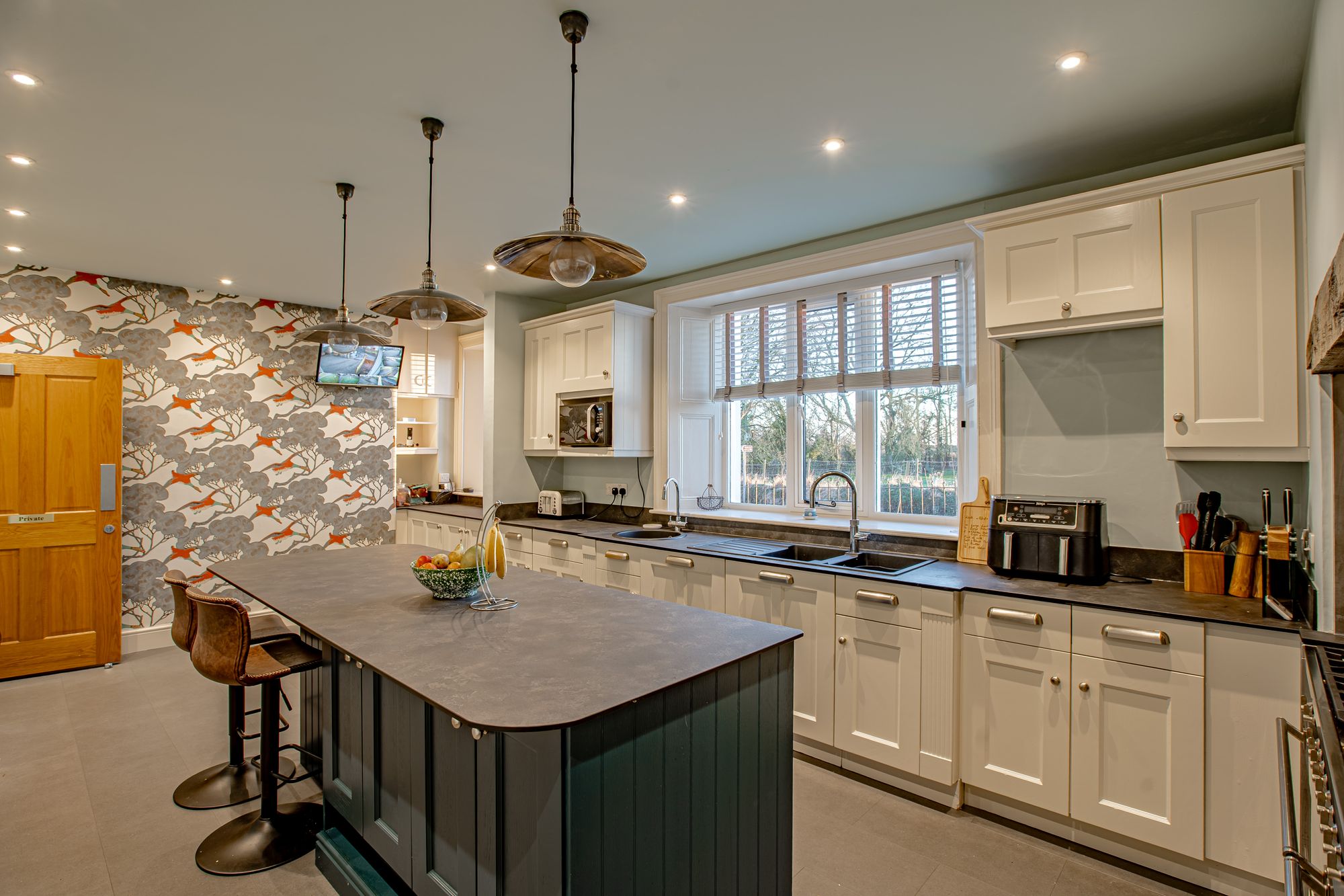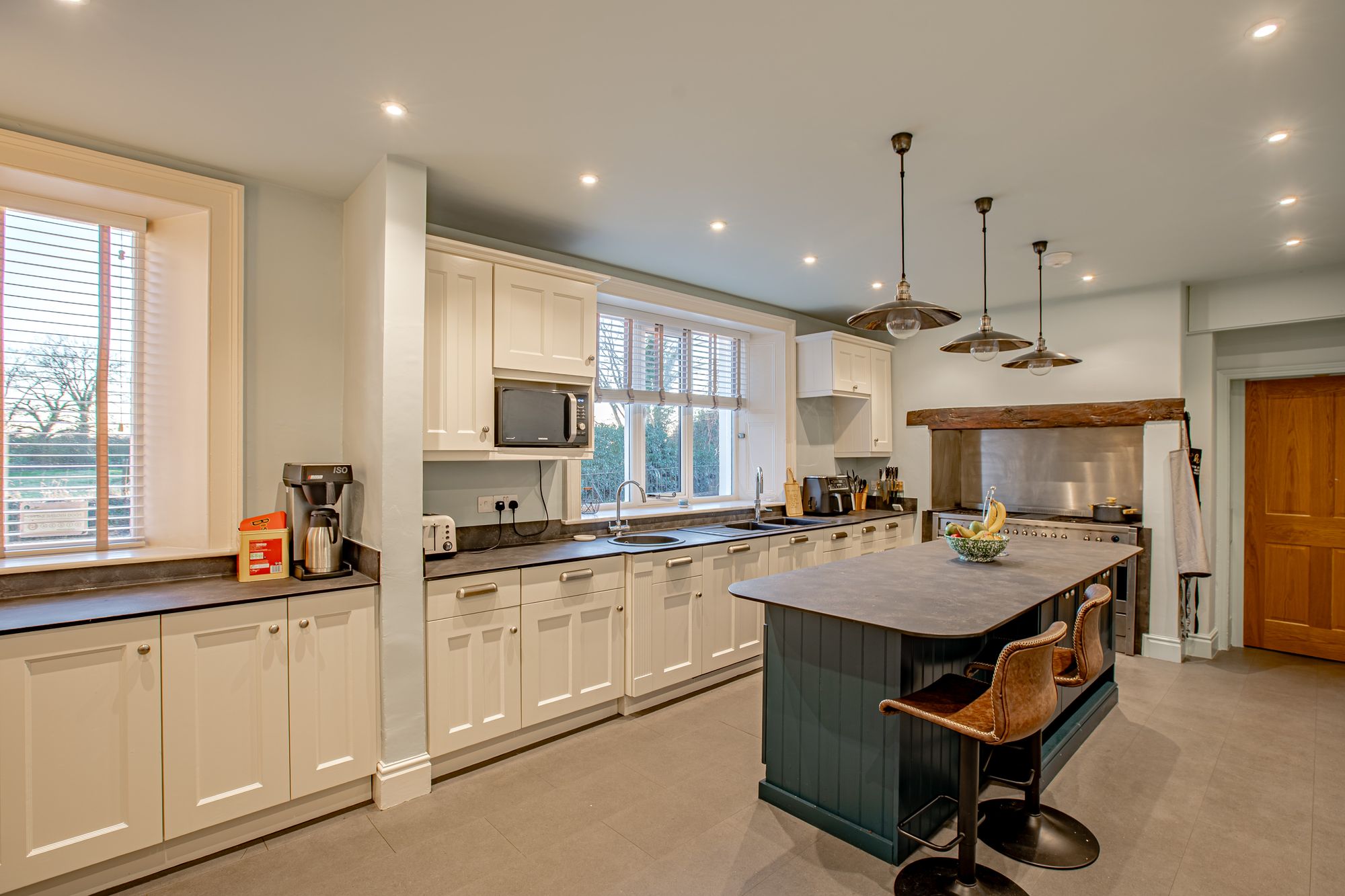 At the heart of the home sits an impressive kitchen of genuine substance. Fitted with high-quality shaker-style cabinetry and contrasting worktops, the room centres around a large island unit. A double-width Smeg range provides six gas burners, an expansive griddle and twin ovens, supported by dual sinks and extensive storage throughout. A substantial walk-in pantry houses multiple fridge freezers and shelving, ensuring functionality on a scale rarely found in residential property. A separate laundry and utility room adds further practicality, with access to the side elevation, coal shed and central yard space.