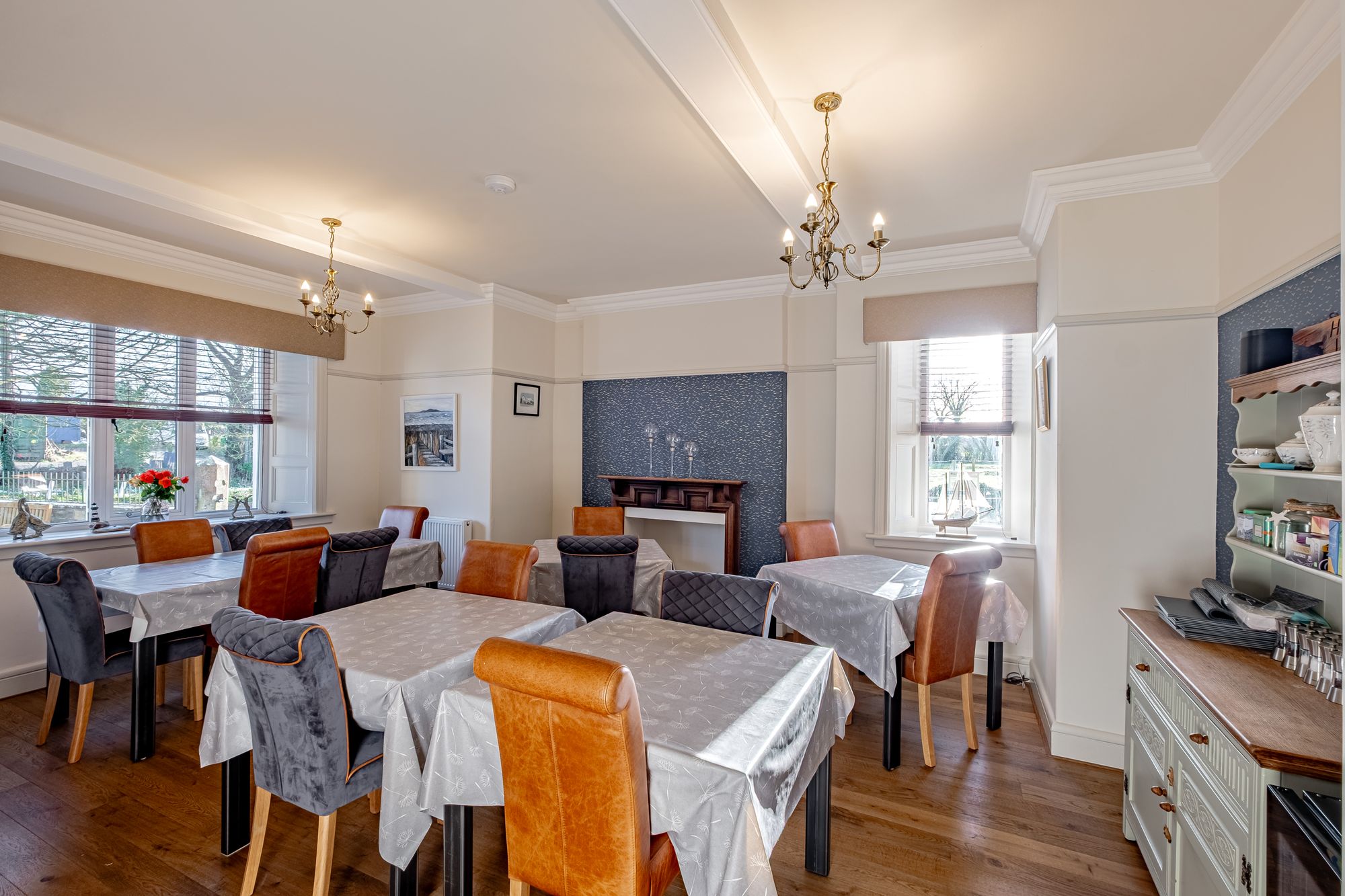 The dining room is elegant and well-proportioned, retaining original coving and detailed window panelling, with oak flooring underfoot. It is a space designed for gathering — equally suited to family occasions or larger-scale entertaining.