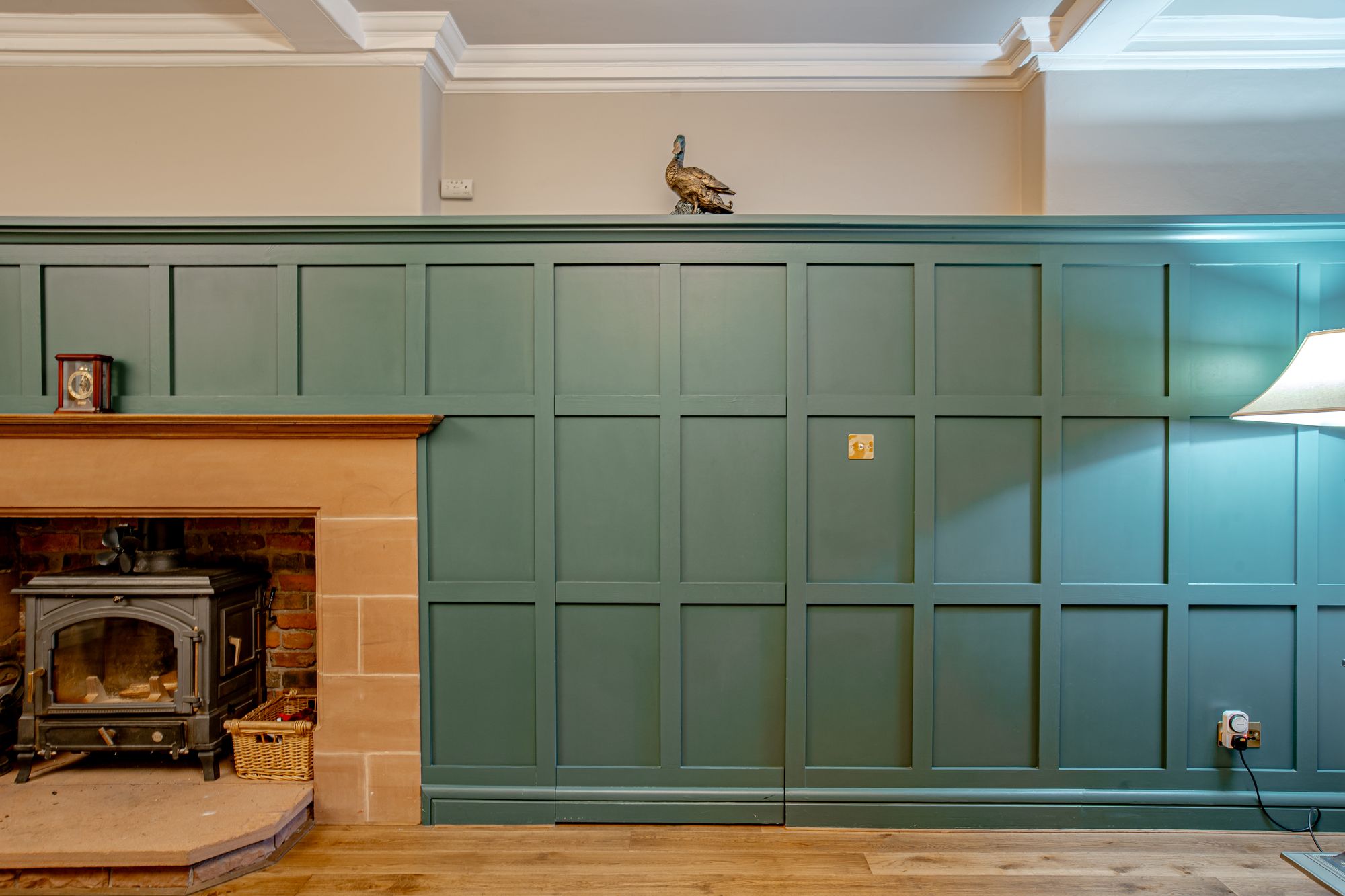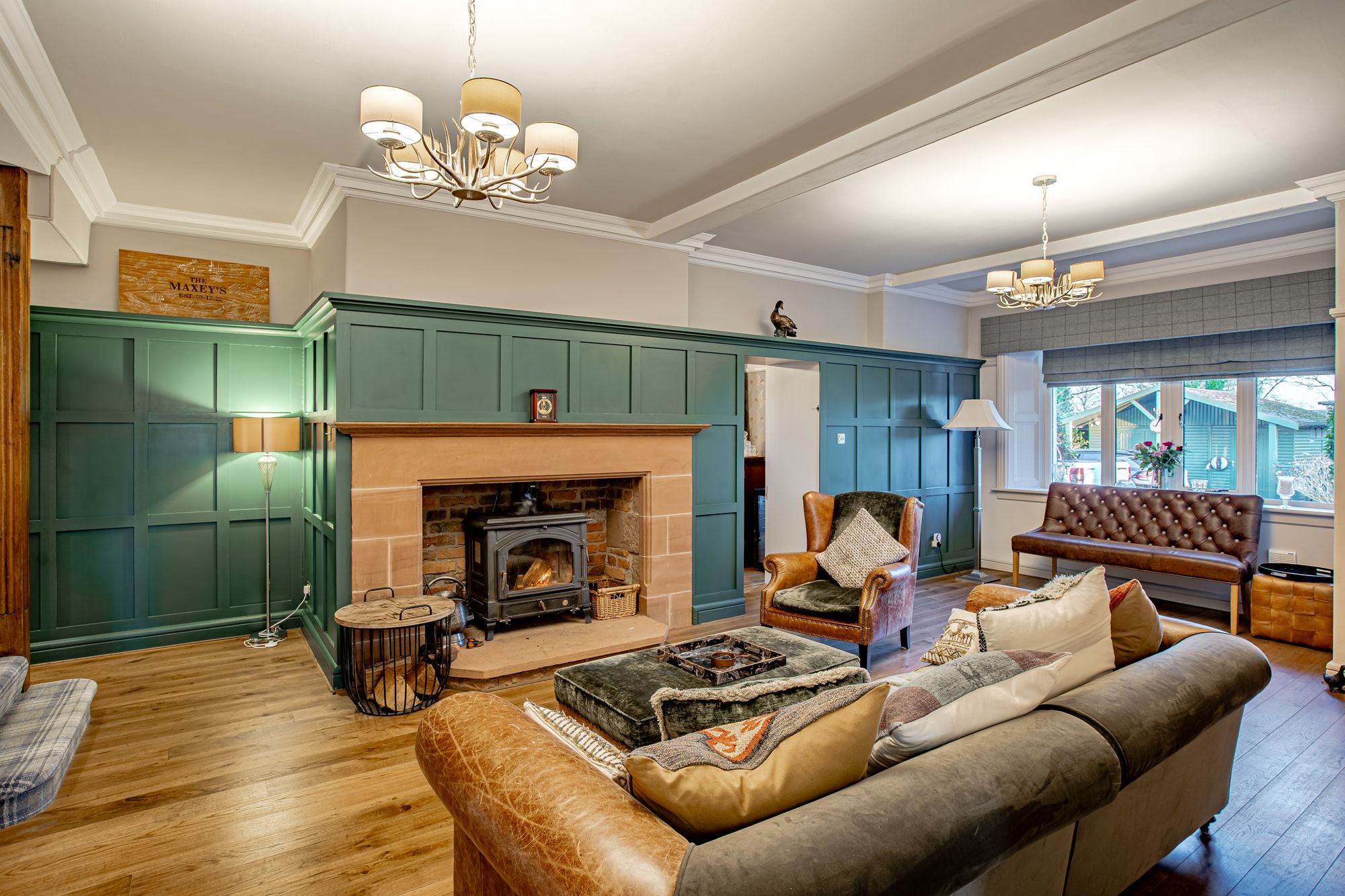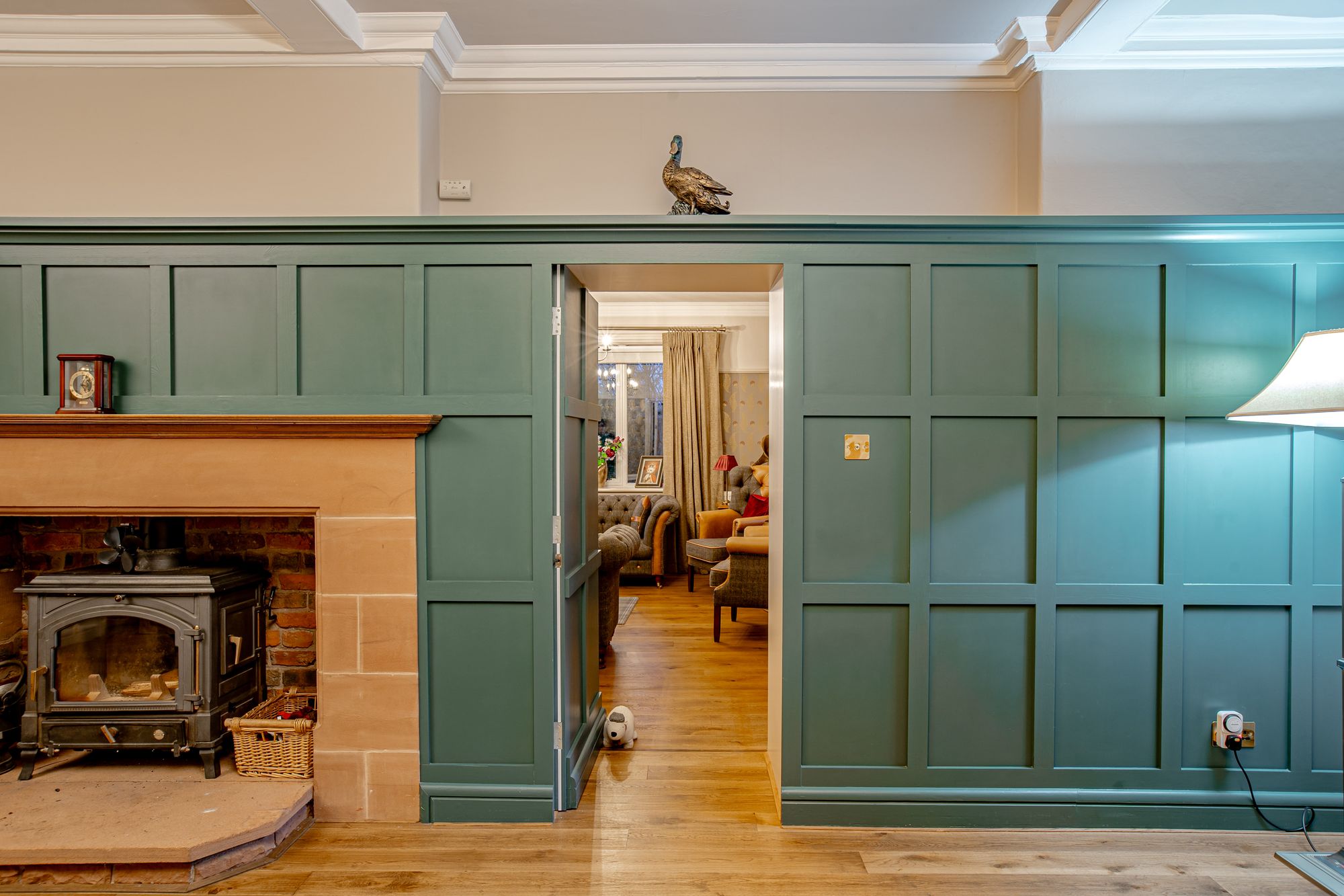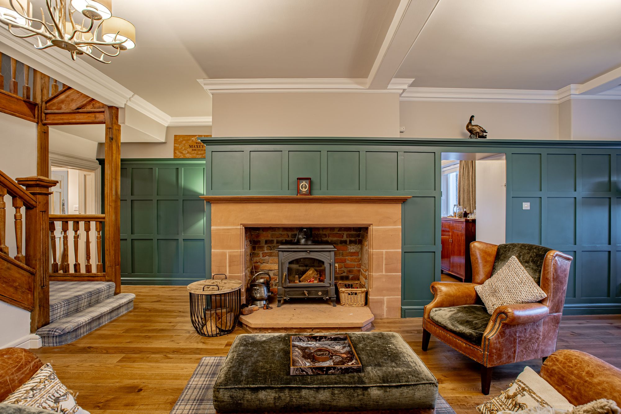 The principal hall flows into a generous reception lounge where a sandstone fireplace with log burner forms a striking focal point. Painted wood panelling adds texture and warmth, balancing the scale of the room and reinforcing the property’s period heritage.