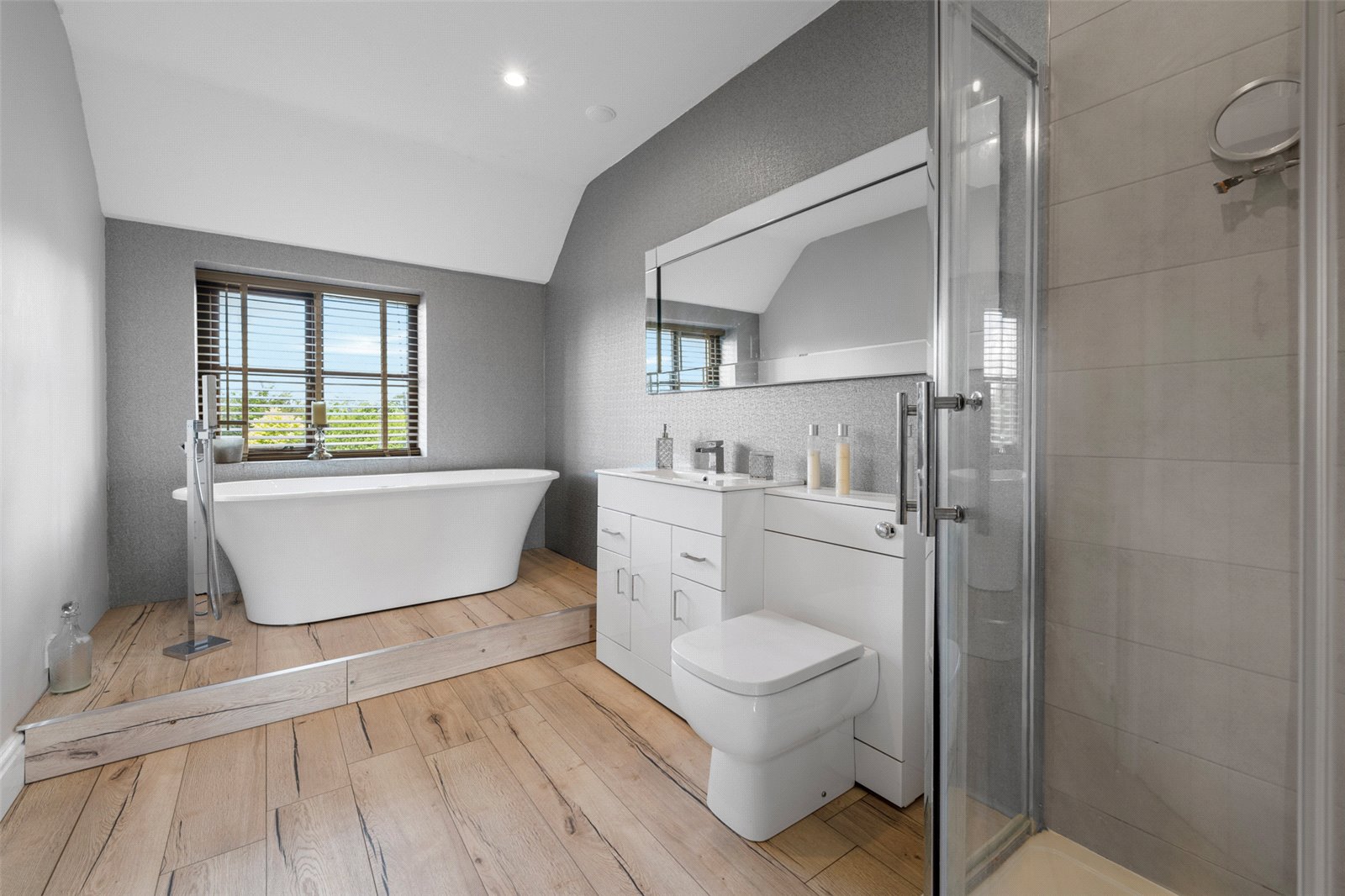 • Family bathroom with wood effect tiled floor, separate shower and bath.