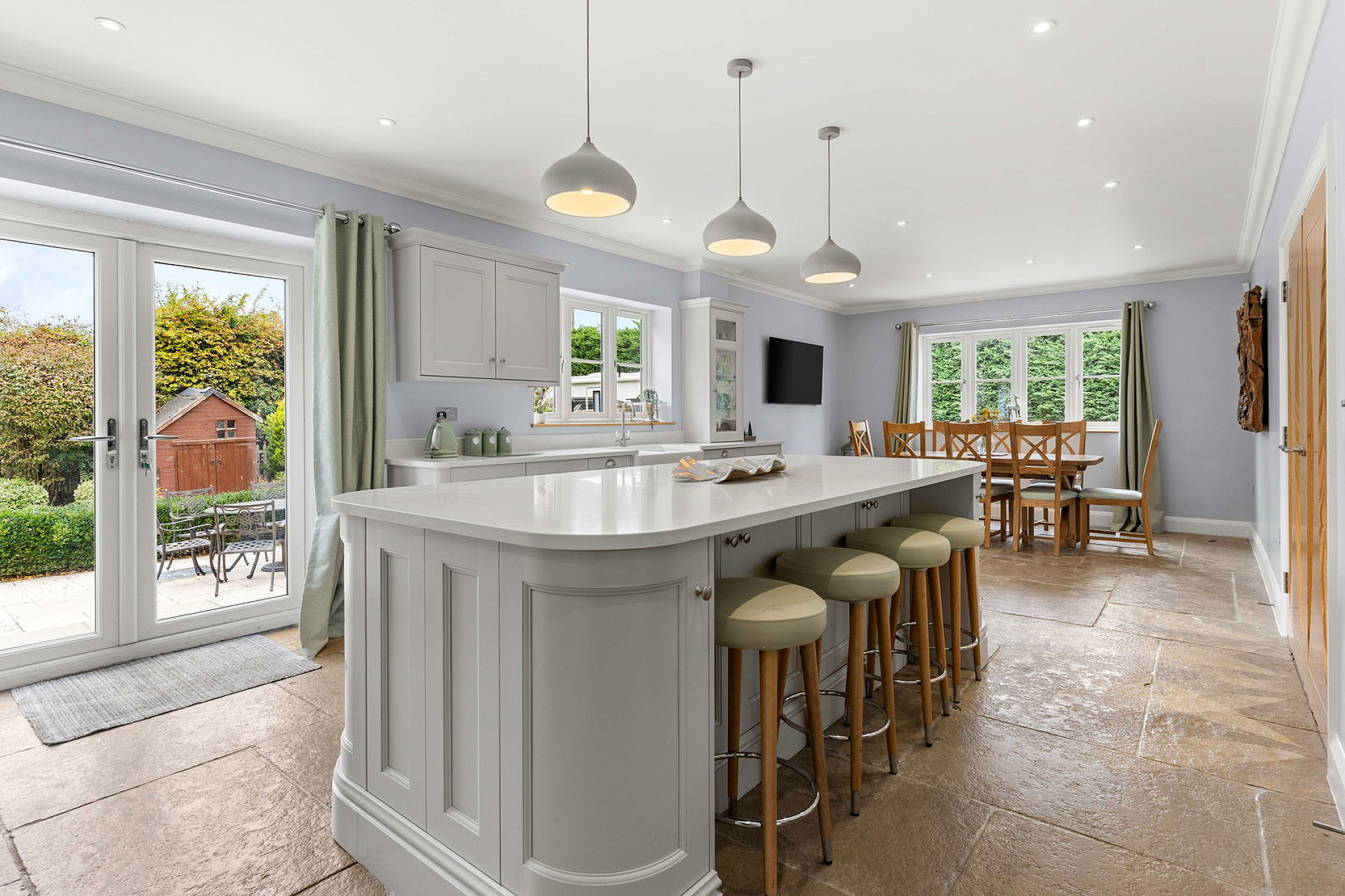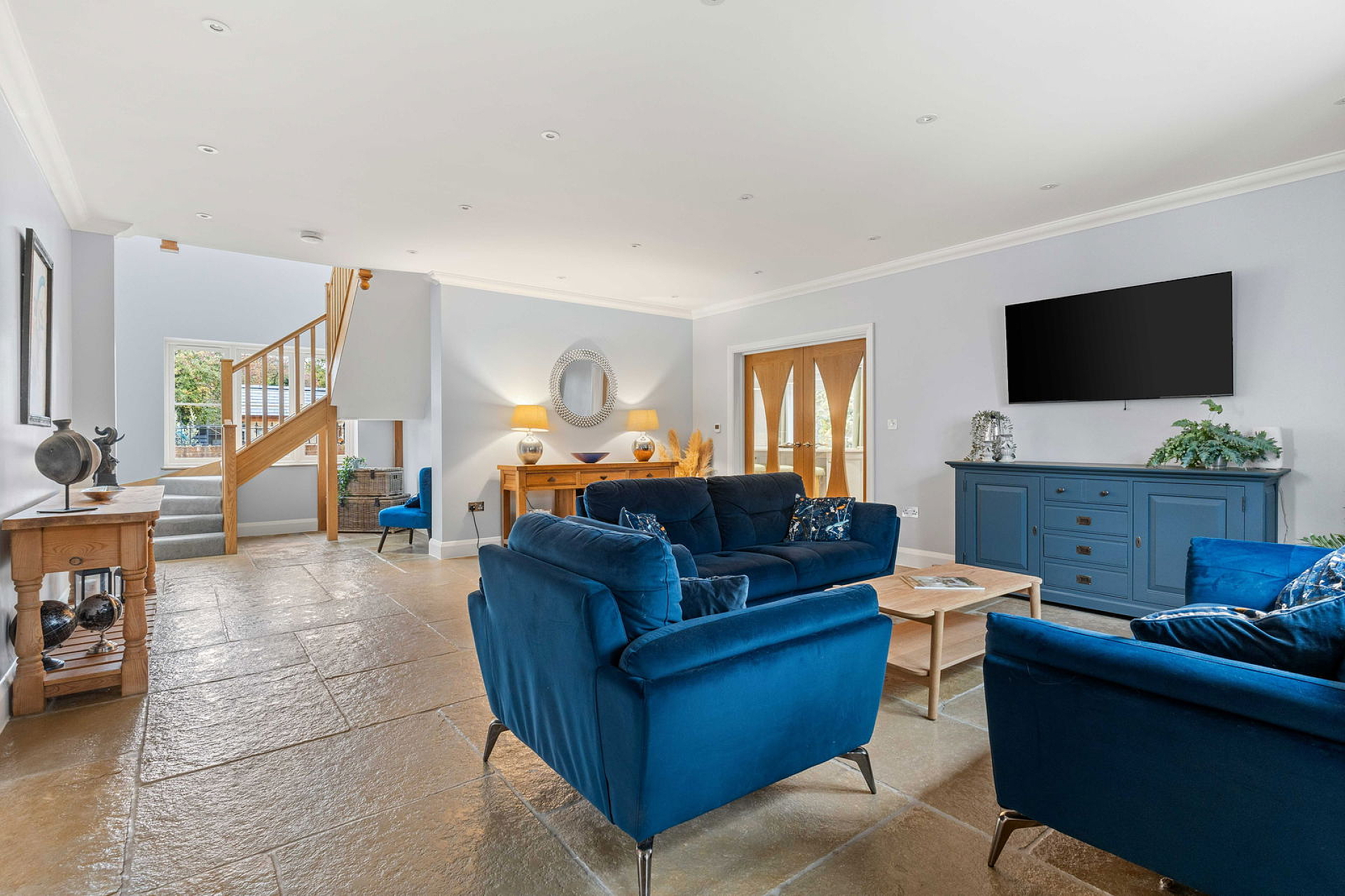 A beautiful oak framed porch welcomes you into the spacious open planned hallway and main living room. A spacious inviting space with underfloor heating throughout the ground floor and flagstone tiled flooring. A wooden staircase and complementary wooden double doors lead you into the heart of this home. A well-designed Howdens kitchen, with central island and breakfast area and a large dining area for when all the family gather. French doors lead out to the side patio and gardens, a lovely place to entertain in the summer months. There is also a cosy sitting room, ideal for the children to use as a play are and tv room. There is a boot room to the rear of the house with a door leading out to a secure patio area and a modern shower room just off the boot room.