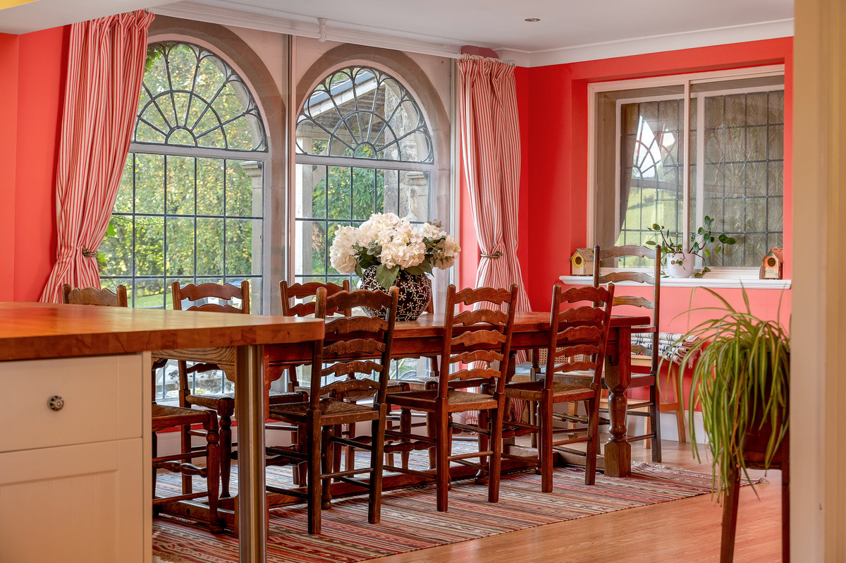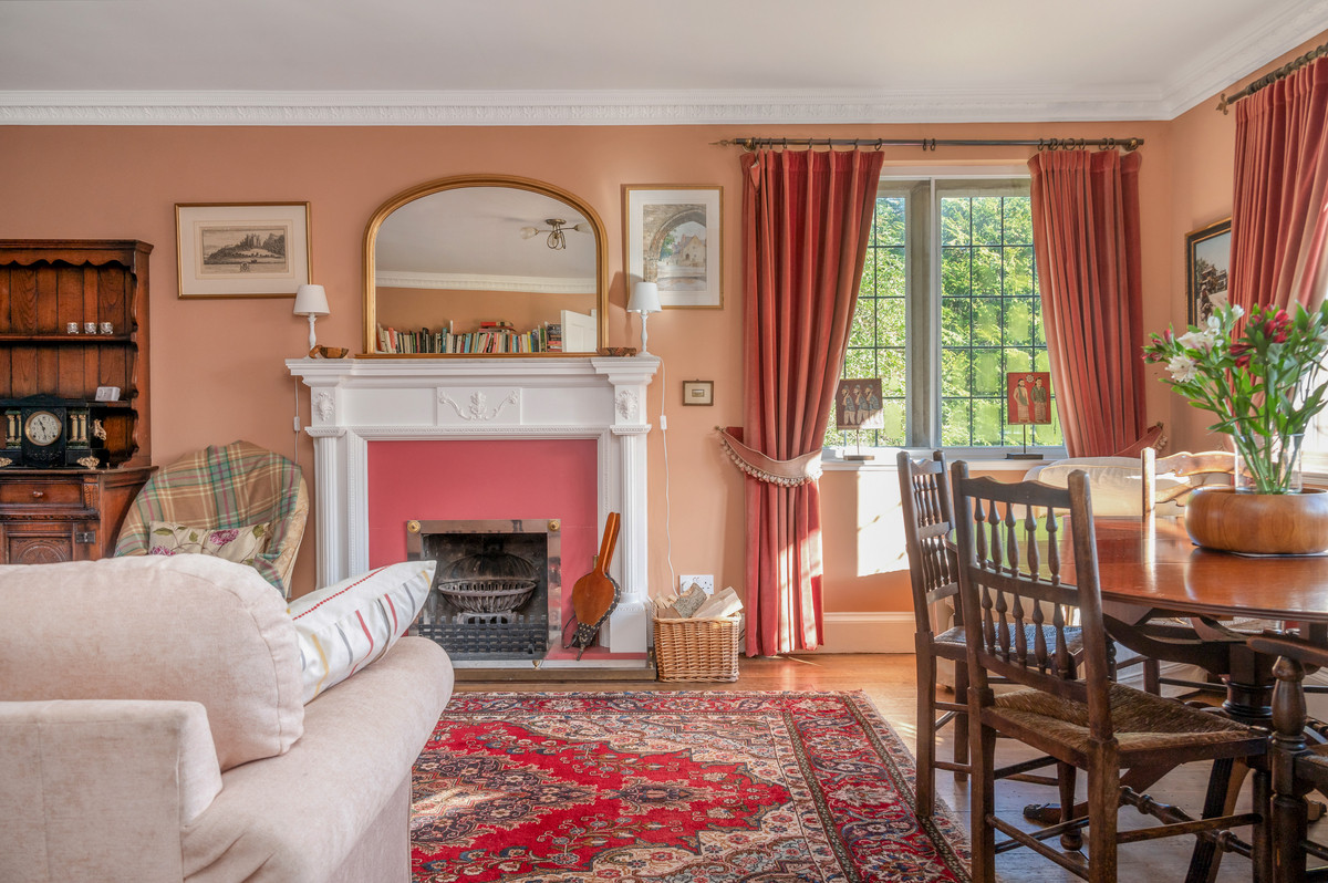 The sophisticated sitting room is both cosy and refined, with a feature fireplace and open working fire as its focal point. The triple-aspect design allows natural light to flood the space while providing beautiful views of the gardens and rolling countryside.