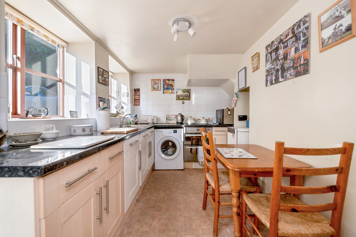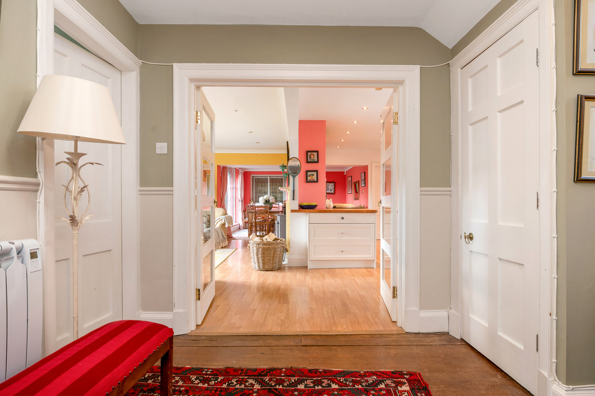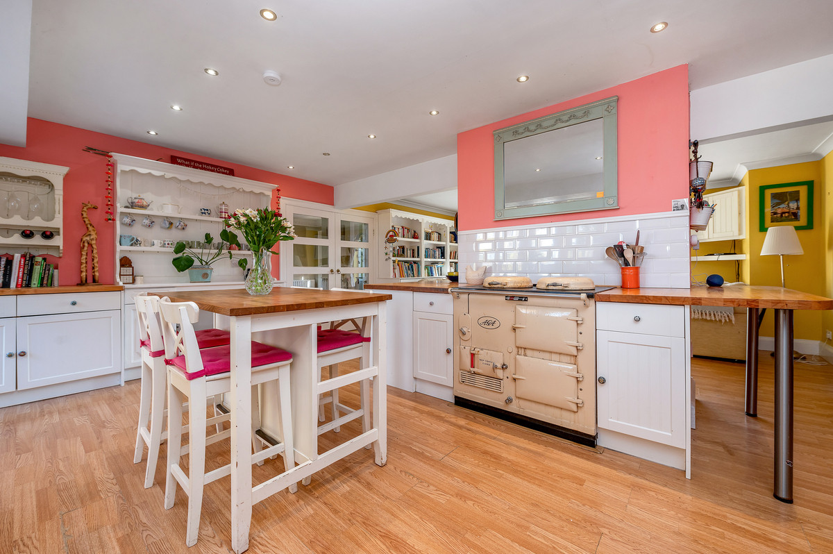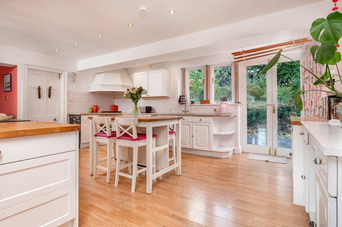 At the heart of the home is the spacious open-plan living kitchen, designed for both daily life and entertaining. This thoughtfully arranged space is divided into three distinct areas by a chimney breast with a marble reclaimed fireplace featuring decorative frieze and wood-burning stove, adding warmth and character. With a dual-aspect layout and French doors leading to a south-facing terrace patio, this space seamlessly connects indoor and outdoor living—perfect for relaxation or alfresco dining.