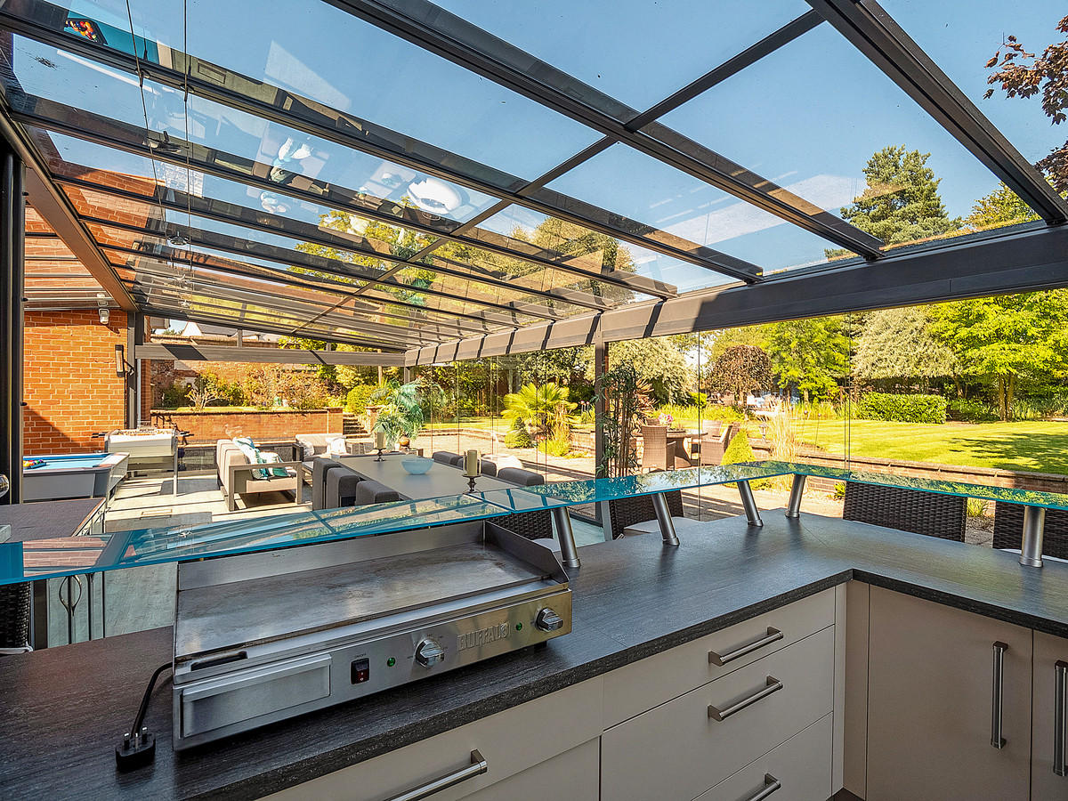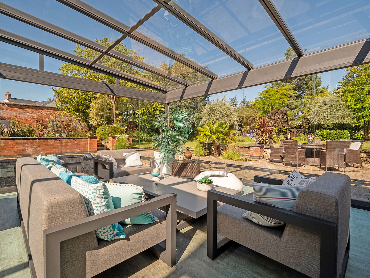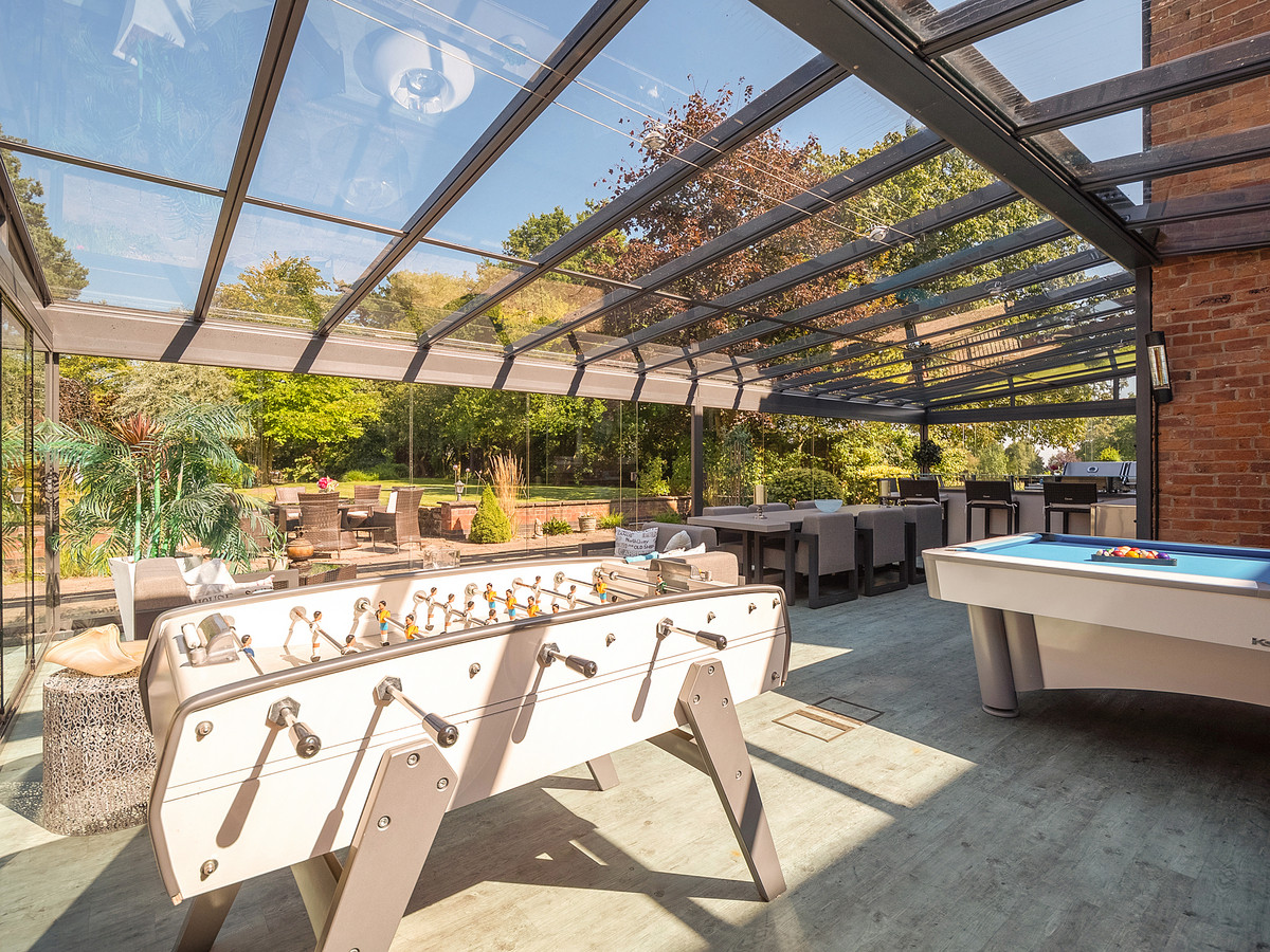 Positioned between the plant room and W/C is a door leading out to the stunning glass garden room that overlooks the manicured landscaped gardens and patio area. This contemporary living space with sliding glass doors and glass roof features an outdoor kitchen and bar area with sink, induction hob, double gas grill, oven and fridges. This room is ideal for entertaining or relaxing with its seating and dining area, hot tub and pool table. The garden room also provides access to another room that features a sauna, shower with hammam and w/c.