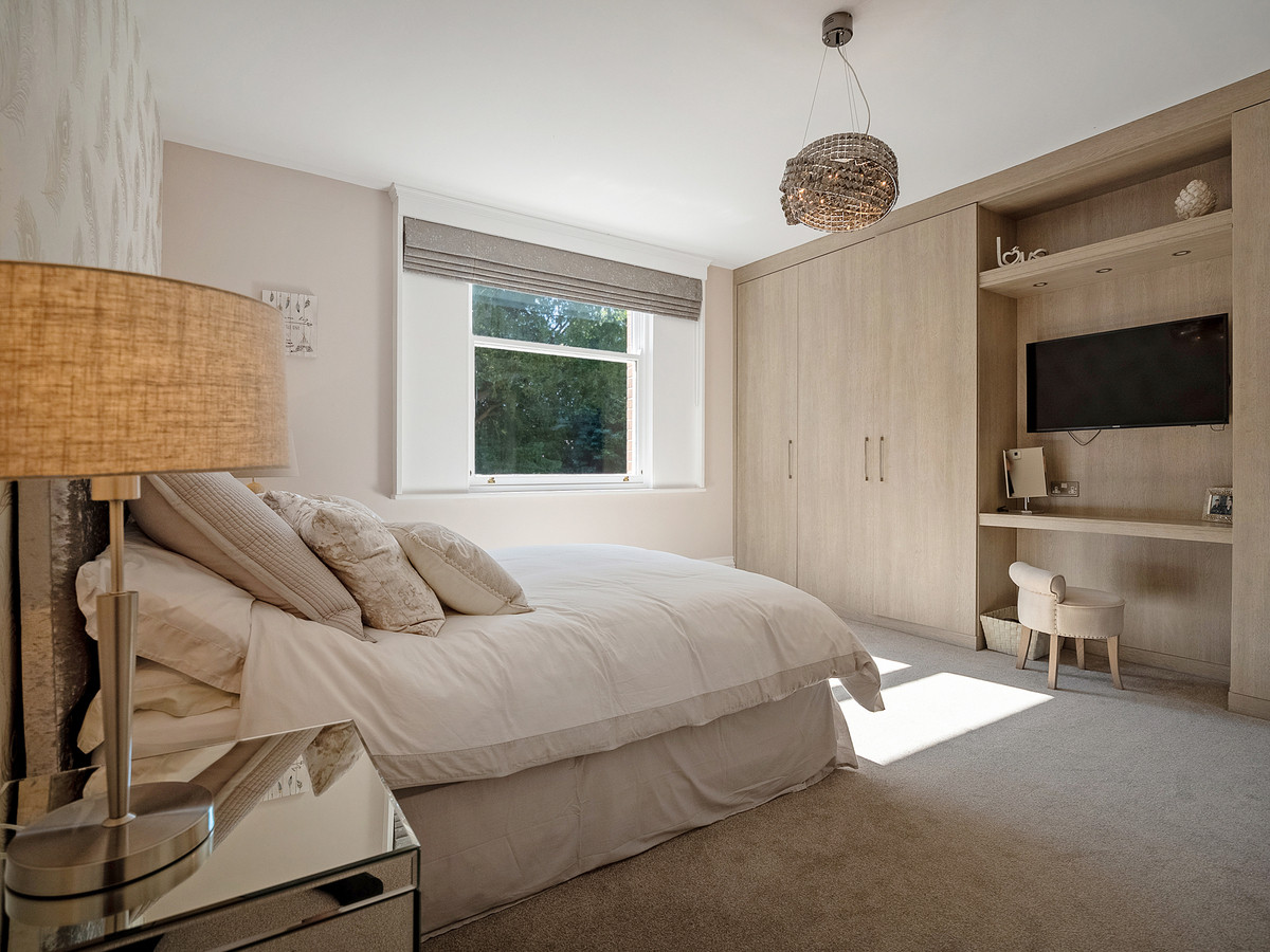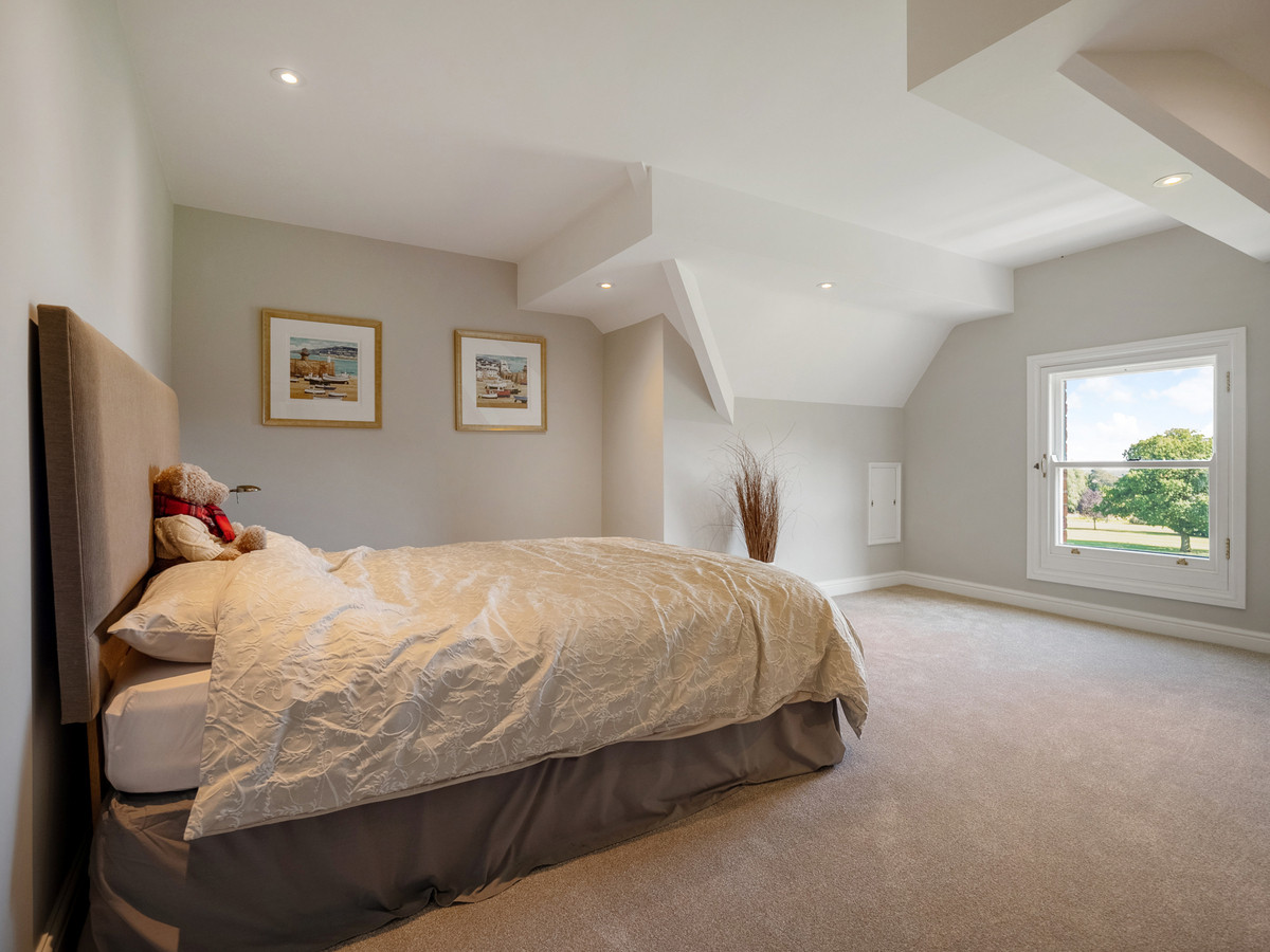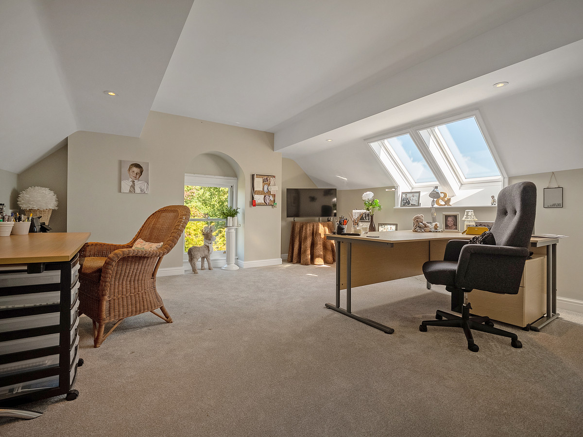 The decorative oak feature staircase gracefully floats up to the first-floor galleried landing with wide corridors and high ceilings. On this floor you have the luxurious and spacious primary bedroom suite which features large double glazed sash windows overlooking the field and nearby church, a walk-in wardrobe with fitted units and centre island, and access to a stunning ensuite with separate walk-in shower, a recessed bath, heated towel rail and Vitra sanitaryware.