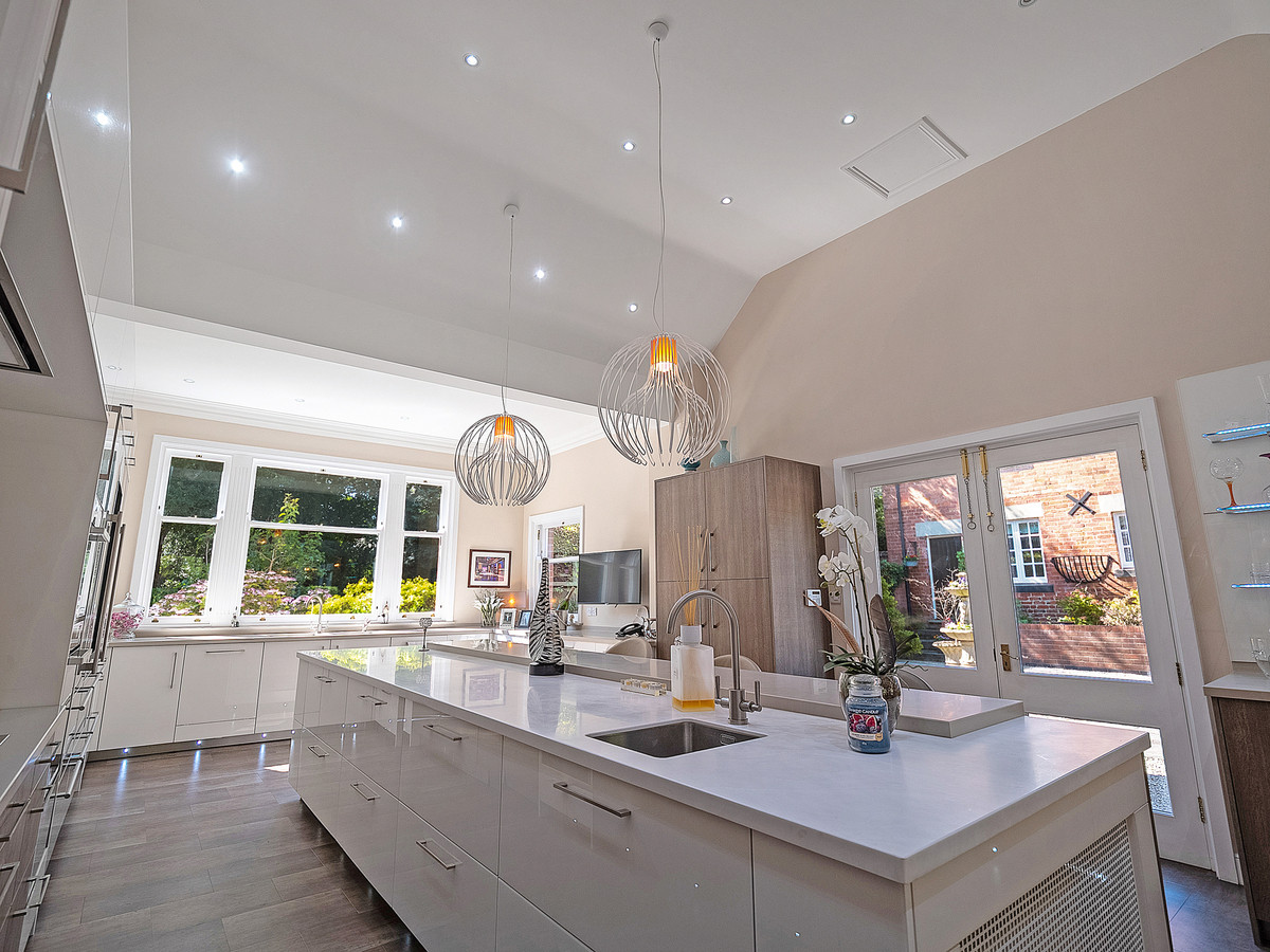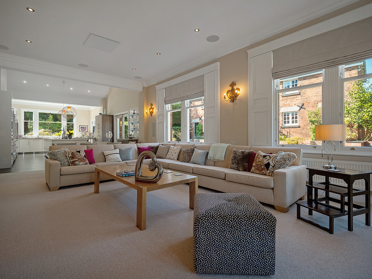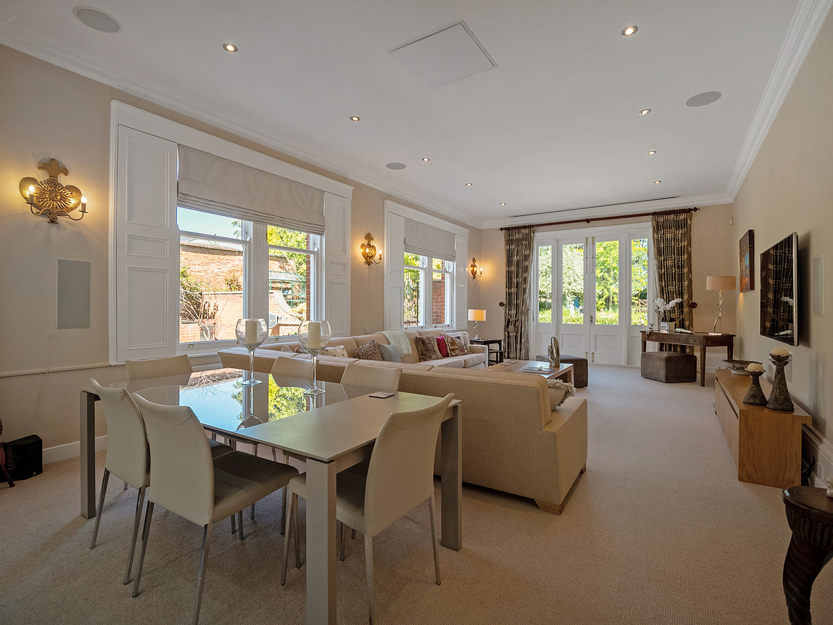 The kitchen has Karndean flooring, high ceilings with recessed spotlights and double-glazed large sash windows which flood the space with natural light making it beautifully bright and airy. The kitchen also provides access to the private courtyard that links the main house to the coach house. Accessed off the kitchen is the fantastic family room with lots of sash windows, high ceilings with built in cinema projector, ceiling speakers and patio doors leading out onto the rear patio area. The windows throughout the property have all been sympathetically replaced by the current owners, to remain in keeping with the style of the property.