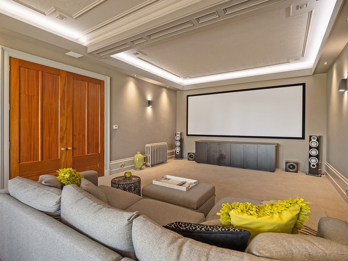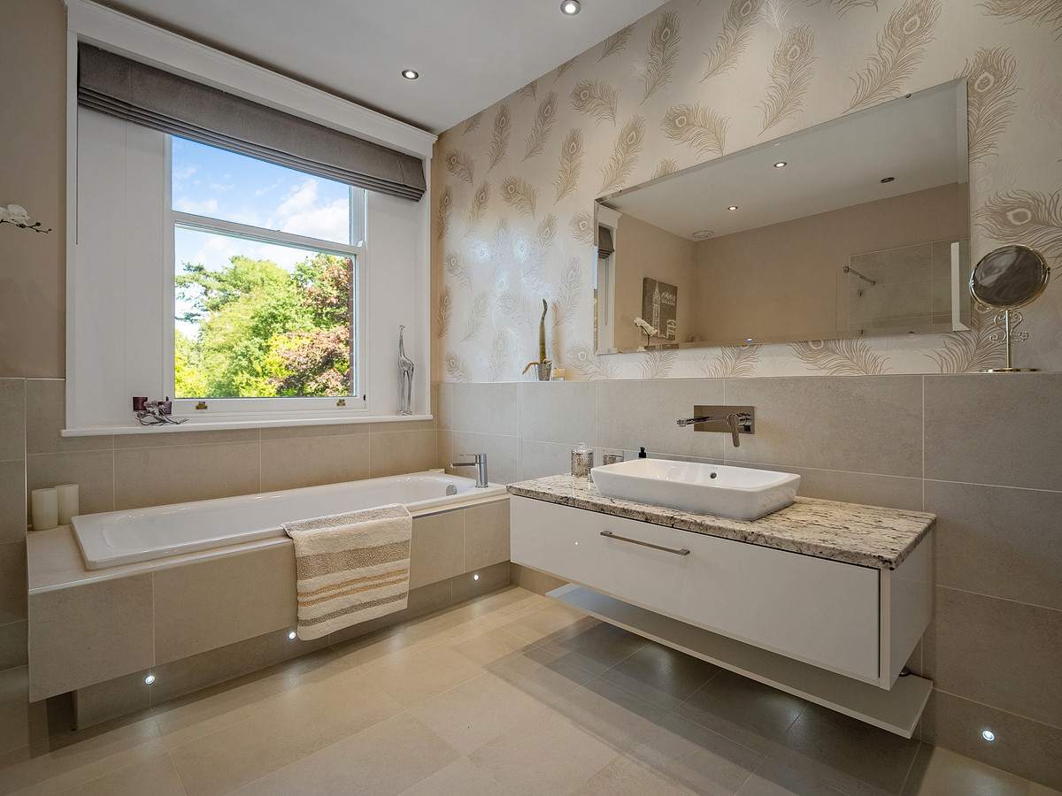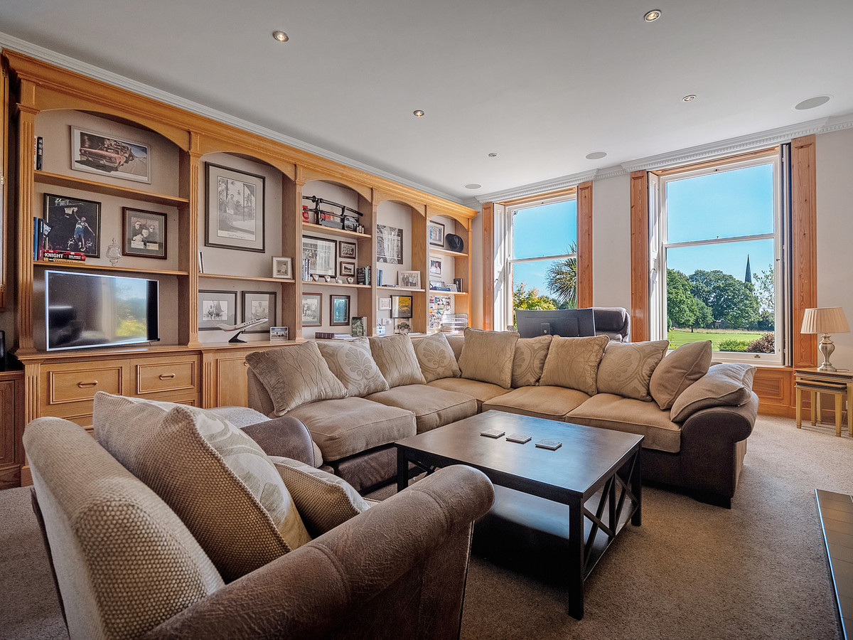 The kitchen has Karndean flooring, high ceilings with recessed spotlights and double-glazed large sash windows which flood the space with natural light making it beautifully bright and airy. The kitchen also provides access to the private courtyard that links the main house to the coach house. Accessed off the kitchen is the fantastic family room with lots of sash windows, high ceilings with built in cinema projector, ceiling speakers and patio doors leading out onto the rear patio area. The windows throughout the property have all been sympathetically replaced by the current owners, to remain in keeping with the style of the property.