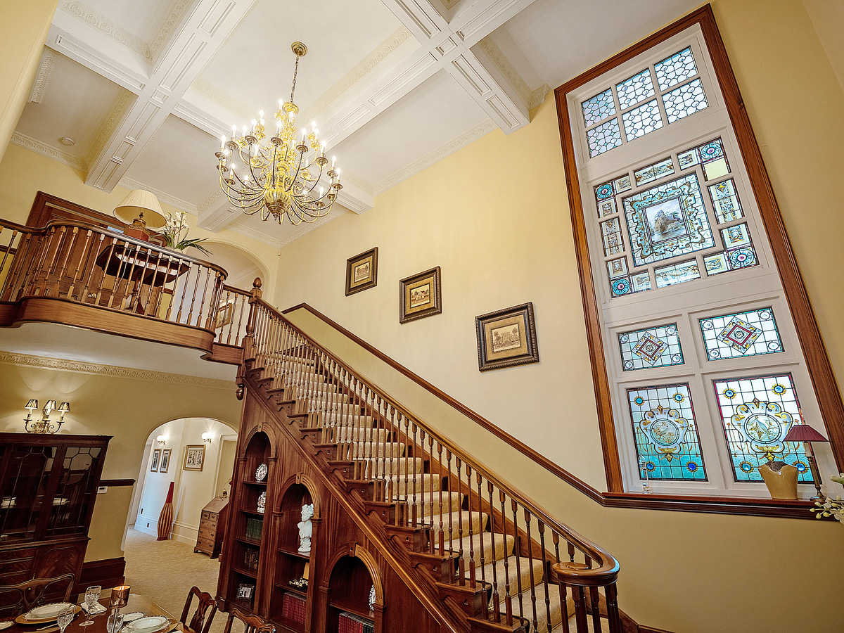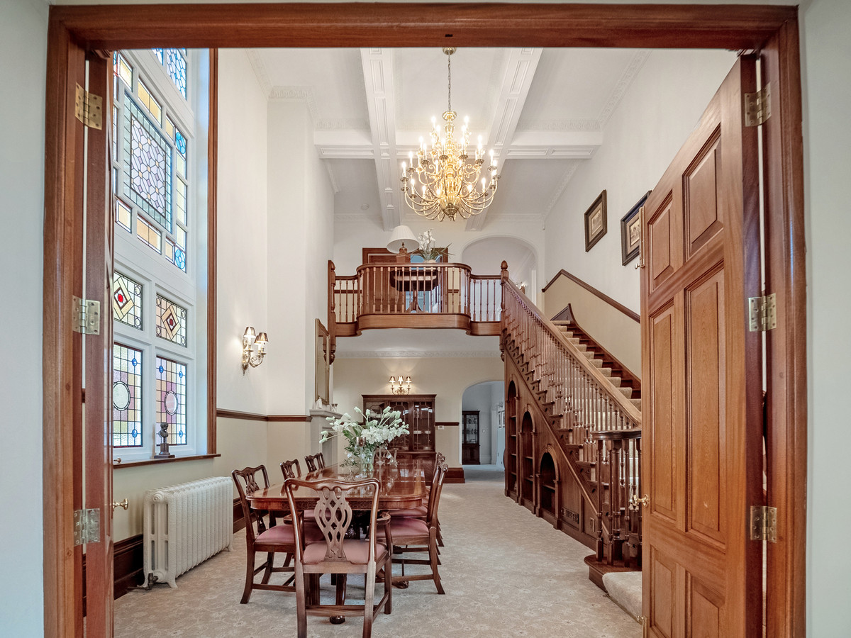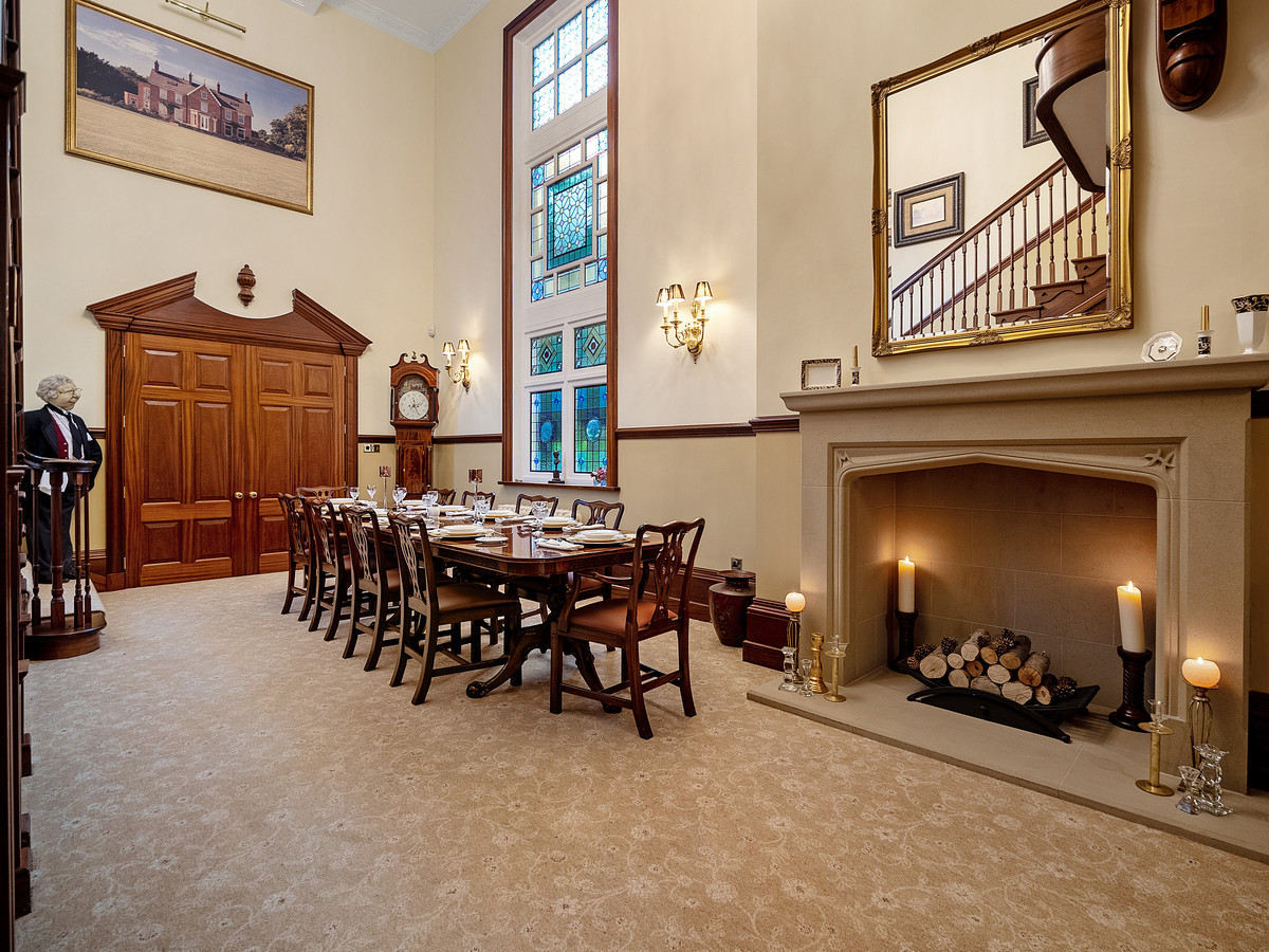 Morley Hall is accessed via large wrought iron electric gates and a long gated private driveway which leads to a large parking area with turning circle, 5 car garage complex, and a large two-bedroom coach house. The entrance of this impressive home is via a large double door into an inner hall with stone flooring, ornate stain glassed windows and seating. The original solid oak door leads into the grand dining hall with double height ceilings and balcony, impressive grand staircase, original stained glassed windows, and a Derbyshire stone fireplace. The dining hall also provides access to a good-sized multi room cellar.
