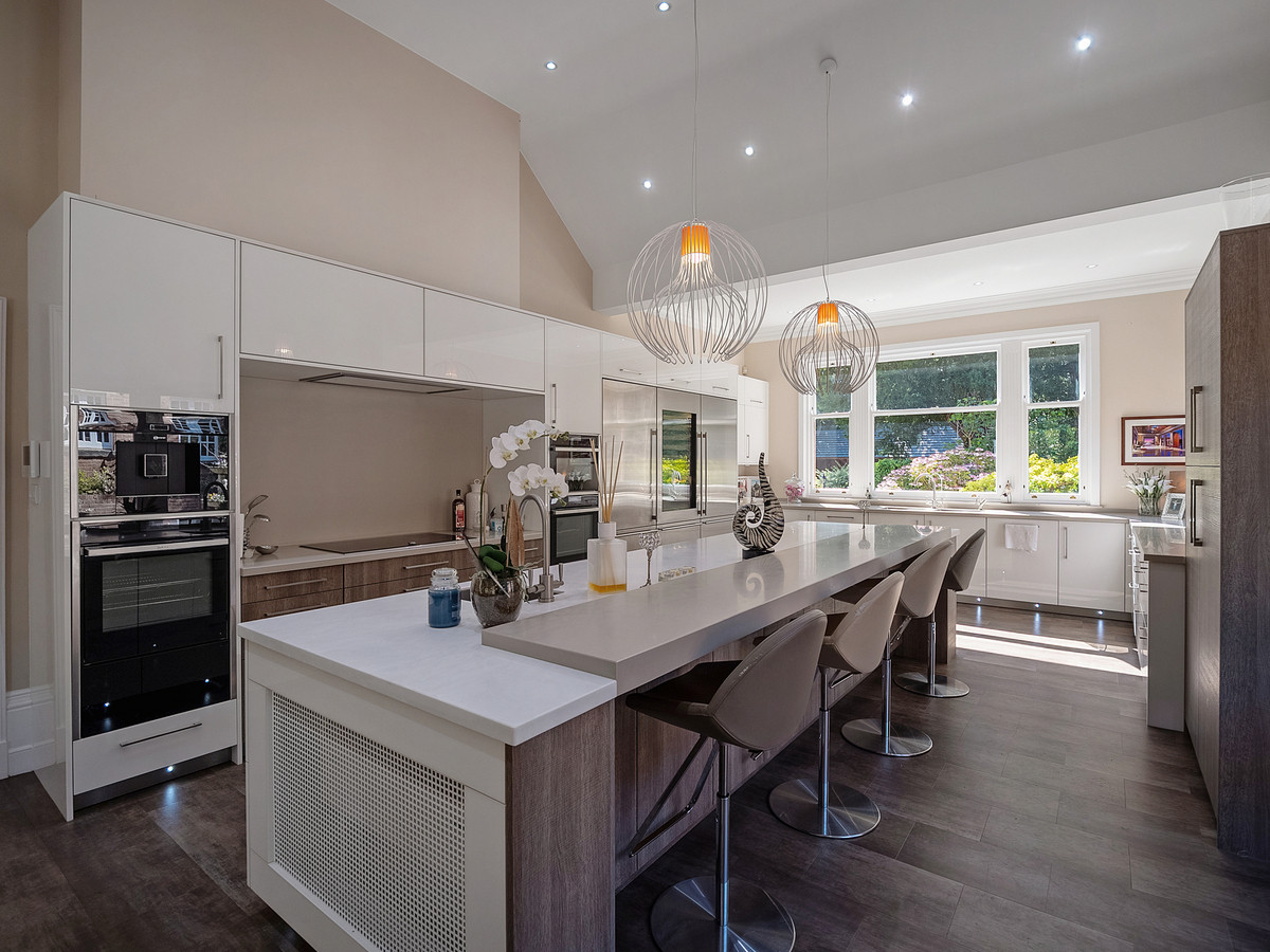 The heart of this magnificent home is the open plan kitchen, breakfast area and entertaining area. The handcrafted kitchen by Creative Interiors is a real feature of this stunning family home. The kitchen boasts a large centre island that benefits from Corian worktops, and an inset stainless steel prep sink. Located to the side of the kitchen are the main cupboard units boasting Neff appliances including two built in ovens, an induction hob, a microwave, two warming draws and a built-in coffee machine. There is also a large commercial grade Sub Zero fridge freezer with wine cooler which gives the kitchen a real contemporary feel. To the rear of the kitchen are two chrome sinks and a Quooker tap.