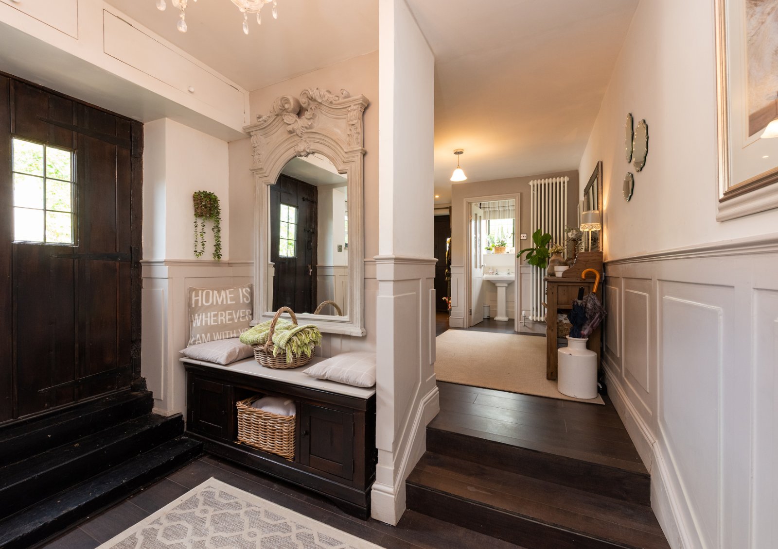 • Original oak framed door leading through to an impressive part panelled reception hall having a tiled floor and exposed beams