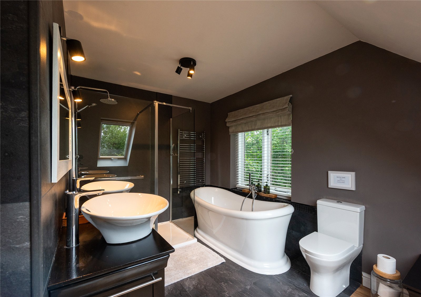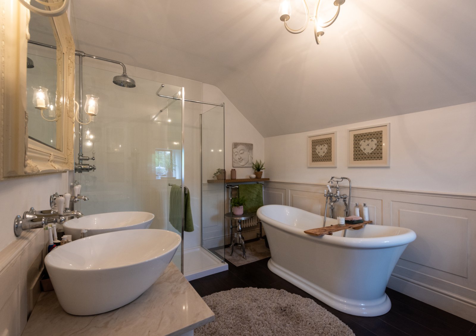 • On the first floor there is a principal bedroom with a luxury en suite bathroom with a roll top bath, twin basins and separate walk in rainwater shower together with a further double bedroom