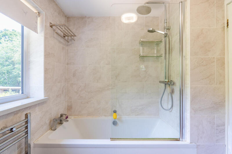 The family bathroom is thoughtfully designed with both practicality and comfort in mind. A fitted bath with overhead shower provides flexibility for either a quick start to the day or a relaxing soak, while the fitted storage units ensure everyday essentials can be neatly organised. The large window brings in natural light, enhancing the sense of space and airiness. This room is perfectly suited to meet the demands of daily living while offering a calm setting for unwinding.