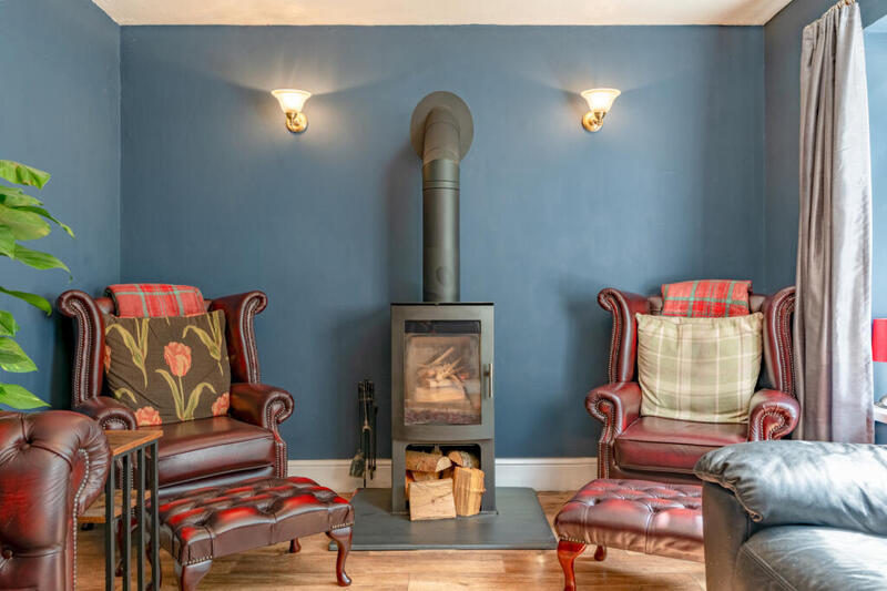 The living room is positioned at the front of the house and enjoys an outlook over the approach. A wide window allows natural light to fill the space, creating a bright and inviting atmosphere. At its heart is a fireplace with wood burning stove that provides both character and warmth. The proportions of the room make it versatile, offering a welcoming setting for daily living as well as a comfortable place to entertain guests.