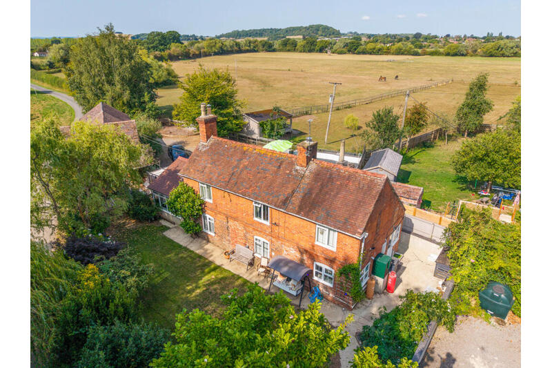 The property is accessed from a gravelled driveway that leads into a generous parking area. The traditional brick façade of the cottage immediately reflects its 1880s origins, with character features including cottage-style windows and a tiled roof. Mature trees and planting soften the approach while open views across the surrounding land create a strong sense of space and rural charm.